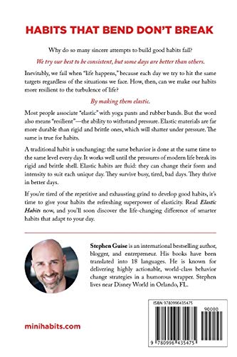 Experience the ultimate habit formation strategy. No two days are the same. By making your habits elastic, you can adapt to conquer every unique day of your life. You will still be surprised by the crazy happenings of life, no doubt, but you will no longer be unprepared for them. Elastic habits give you an answer for every situation. They destroy excuses naturally, by saying, “Okay. How about doing this instead?” If normal habits are a hammer, elastic habits are your grandfather’s garage, a magical place with a tool for every need. It’s not a burden to have a hammer, a wrench, and a screwdriver–you simply select the one you need for the job. In this book, you’ll find a comprehensive framework of elasticity for habit building. Elastic materials are stronger than rigid, brittle materials because they can adapt to pressure. The same is true for habits. Any dread or sense of monotony you’ve felt about forming habits will disappear, because this system is dynamic and exciting. Your elastic habits can survive threats and thrive in favorable circumstances. There’s no downside because they’re simply a smarter version of the habits we typically try to form. Read Elastic Habits, and you’ll soon discover the power and freedom of smarter, flexible habits that adapt to your day.