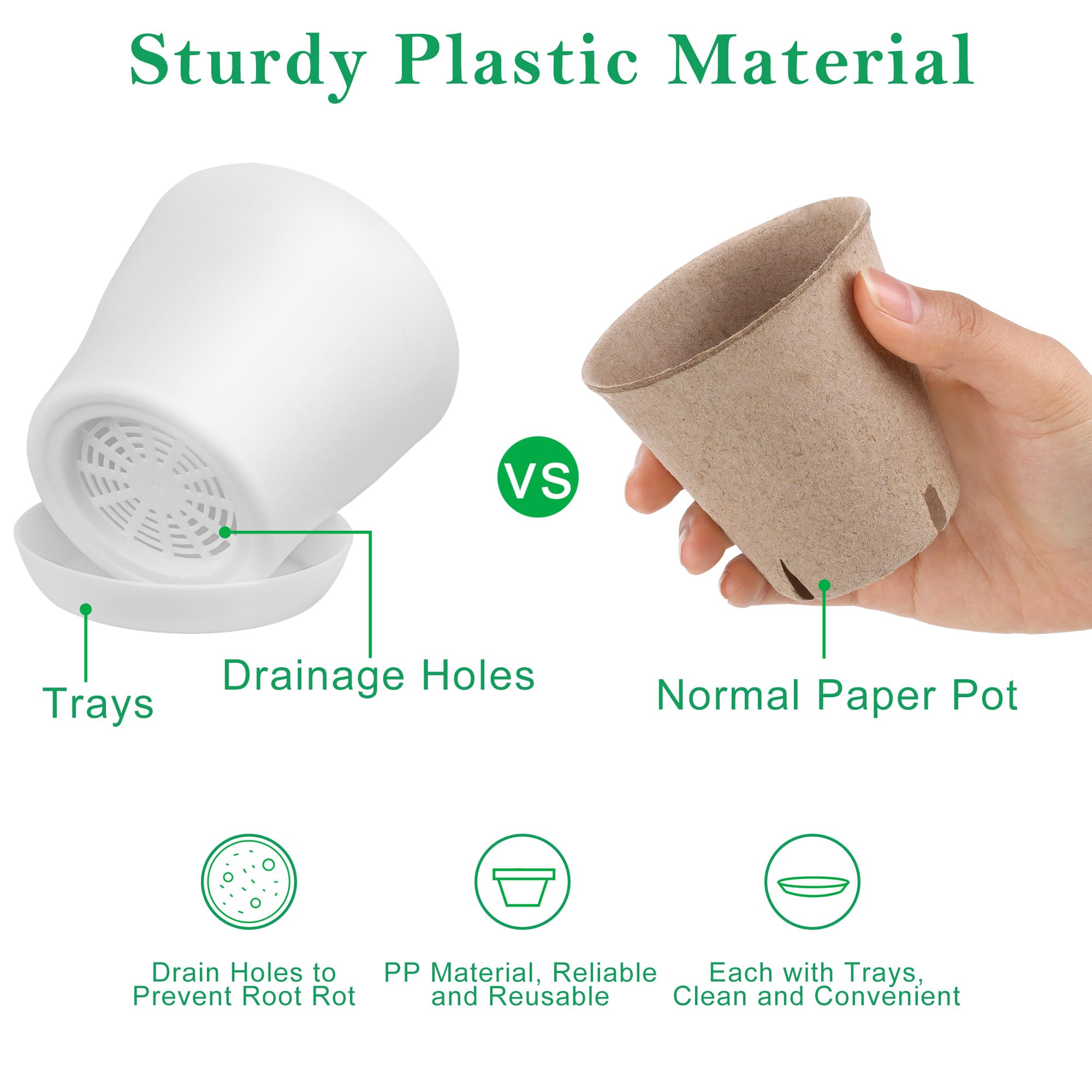 • Quality Plastic Pots: our garden plastic pots are made of strong plastic and come with their own trays, each measuring about 3.94 x 3.35 x 2.76 inches/10 x 8.5 x 7 cm, these lightweight, waterproof pots are reliable and reusable, designed with bottom holes to avoid clogged drainage, avoiding soil leakage and promoting plant health