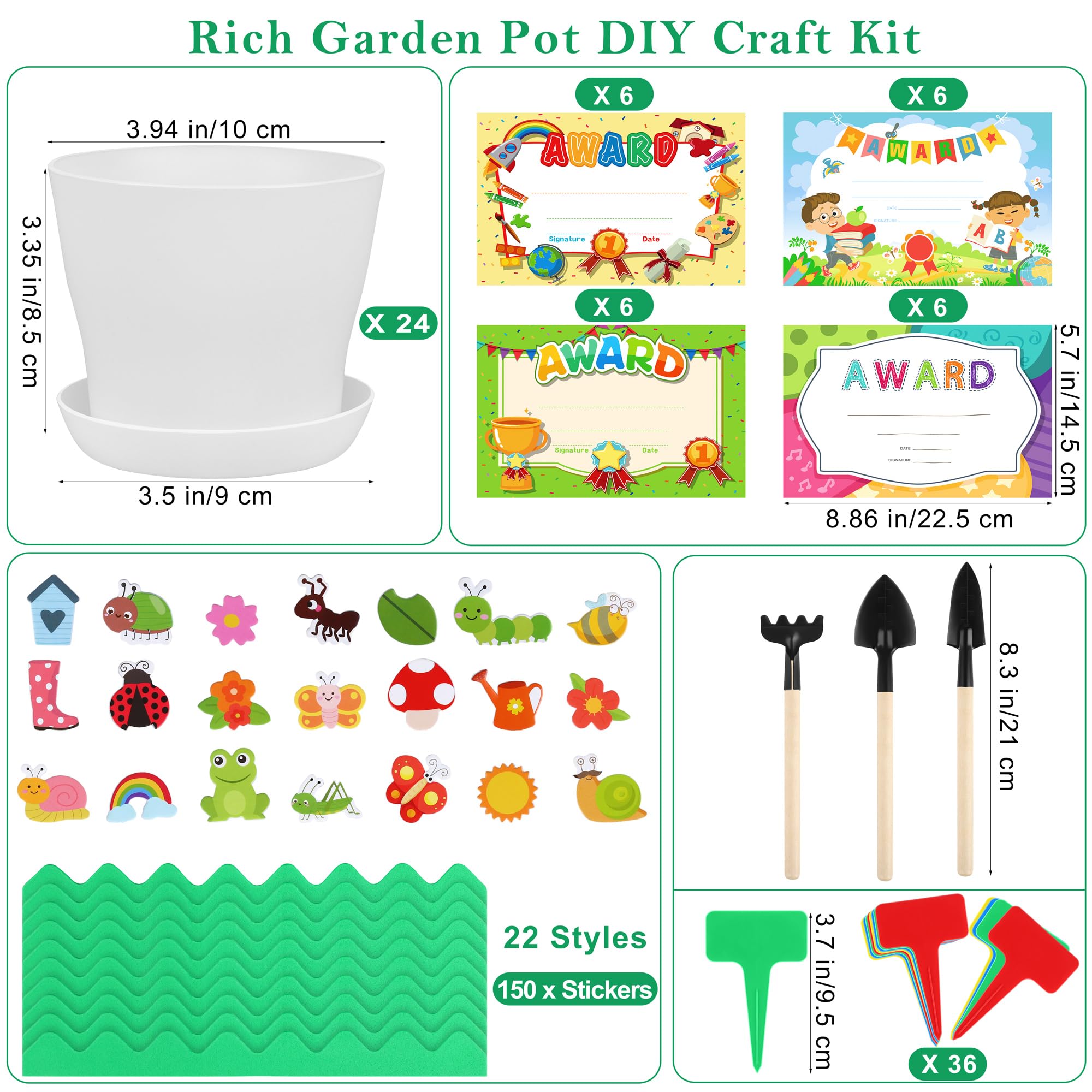 • Plastic Pot Craft Kit: comes with 150 charming adhesive stickers in 22 assorted styles featuring bees, flowers, frogs, rainbows, ants, butterflies, water kettles, grasslands, snails, etc., cultivate your green thumb with 24 round white plastic flower pots, a 3-piece seeding toolset, 36 plant labels, and 24 certificate of awards, making every planting adventure an occasion for celebration; unleash springtime creativity with our DIY craft bundle!