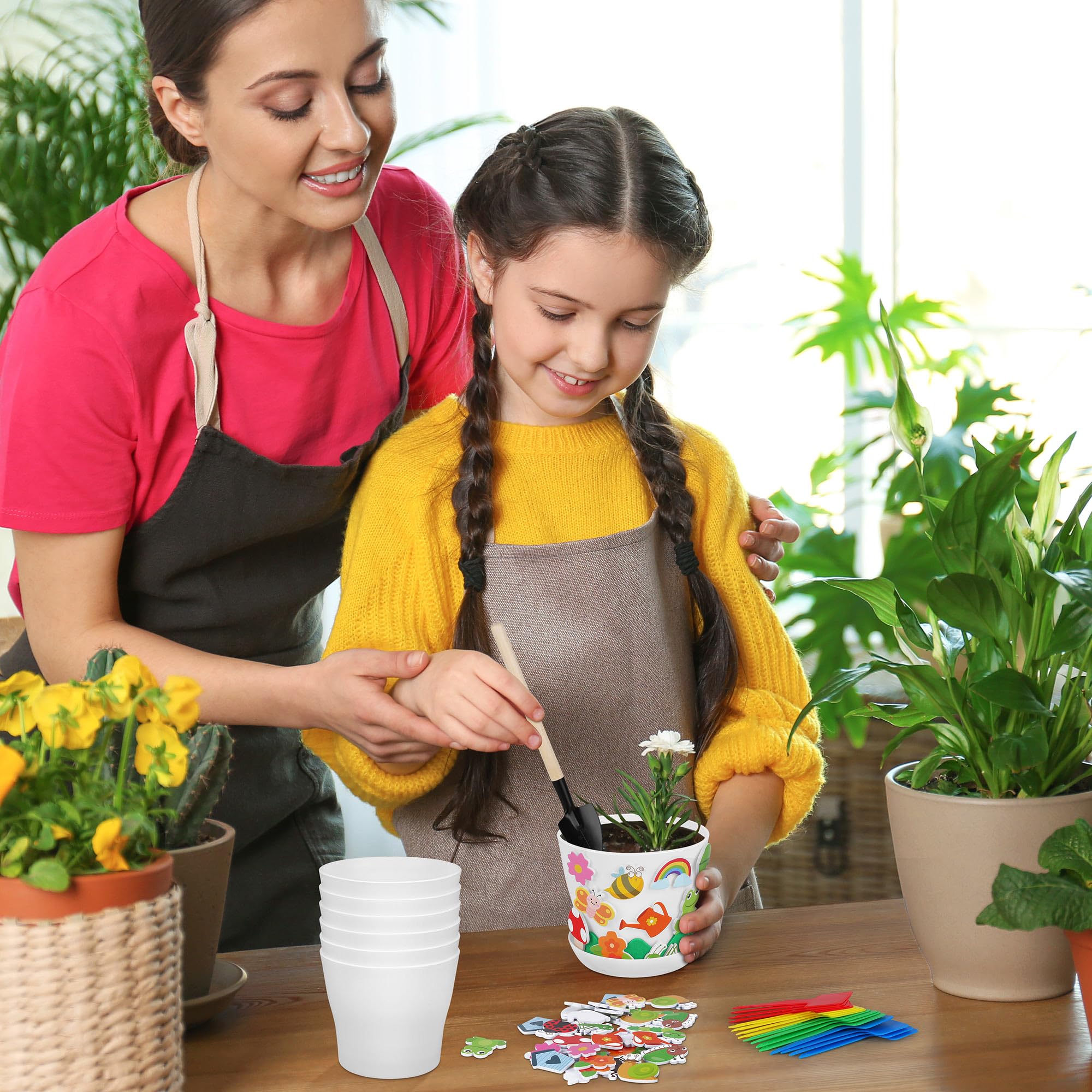 Elcoho 24 Packs Garden Plastic Pot Craft Kit Plant Spring Craft Kits for Kids Flower Pots with 150 Foam Stickers 36 Labels 24 Certificate of Awards 3 Tools Planting Growing Kit for Kids
