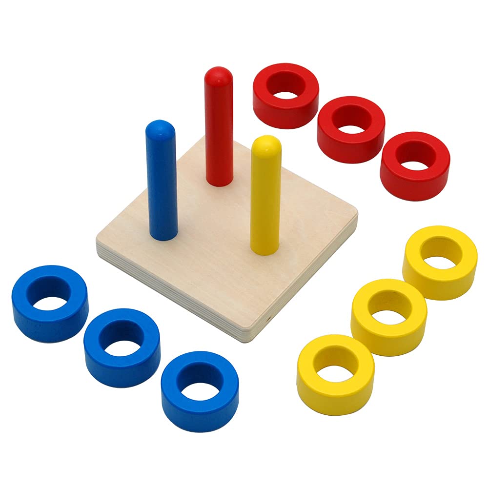 - The set consists of nine colored discs (3 in red, 3 in blue, 3 in yellow) and a corresponding base with three vertical dowels.