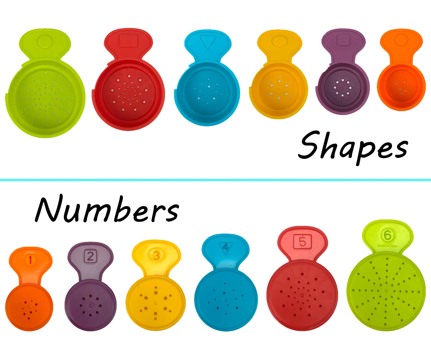 - Early Education Learning Toy: Every cup has cut cartoon number from 1 to 10 on the side, and 10 different fruit patterns. Each bottom of the cup embossed cute animals for learning. Every spoon has an embossment of shape patterns at the upper side of the handle and embossed numbers from 1-6 at the back of the handle. Kids can learn the concept of numbers, shapes, animals, it also develops toddlers’ fine motor skills, hand-eye coordination ability, and open up baby’s imagination.