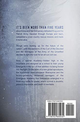 It’s been more than five years since Kress and her Conspiracy defeated Krug and his Patriot Army, traveled through Europe and back, completed a cross-country rescue mission, and made it home alive. Things were looking up for the future of the nation…until the members of the Cult of the Devoted and the teenagers of the Army of the Unsettled decided to light the fuse for an all-out civil war. Now, a special Academy–hidden high in the mountains and designed as a school to train young Emergents in the use of their abilities–is being forced into the fight. On the brink of a new global apocalypse, the mysterious raven-whisperer Branwynne and the techno-genetically enhanced teenagers of the Emergents Academy find themselves entangled in a three-way battle for power, where survival is doubtful, peace is impossible, and death is inevitable.