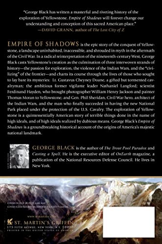 “George Black rediscovers the history and lore of one of the planet’s most magnificent landscapes. Read Empire of Shadows, and you’ll never think of our first–in many ways our greatest–national park in the same way again.” –Hampton Sides, author of Blood and Thunder Empire of Shadows is the epic story of the conquest of Yellowstone, Wyoming, a landscape uninhabited, inaccessible and shrouded in myth in the aftermath of the Civil War. In a radical reinterpretation of the nineteenth century West, George Black casts Yellowstone’s creation as the culmination of three interwoven strands of history – the passion for exploration, the violence of the Indian Wars and the “civilizing” of the frontier – and charts its course through the lives of those who sought to lay bare its mysteries: Lt. Gustavus Cheyney Doane, a gifted but tormented cavalryman known as “the man who invented Wonderland”; the ambitious former vigilante leader Nathaniel Langford; scientist Ferdinand Hayden, who brought photographer William Henry Jackson and painter Thomas Moran to Yellowstone; and Gen. Phil Sheridan, Civil War hero and architect of the Indian Wars, who finally succeeded in having the new National Park placed under the protection of the US Cavalry. George Black1s Empire of Shadows is a groundbreaking historical account of the origins of America1s majestic national landmark.