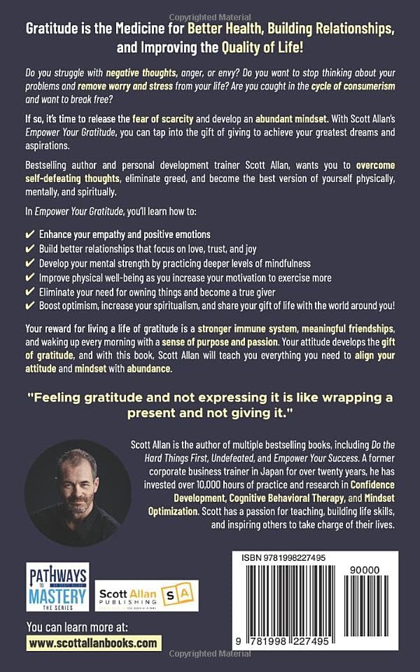 **Gratitude is the Medicine for Better Health, Building Relationships, and Improving the Quality of Life!** Do you struggle with negative thoughts, anger or envy? Do you want to stop thinking about your problems and remove worry and stress from your life? Are you caught in the cycle of consumerism and want to break free? If so, it’s time to release the fear of scarcity and develop an abundant mindset. With Scott Allan’s Empower Your Gratitude, you can tap into the gift of giving to achieve your greatest dreams and aspirations. Bestselling author and personal development trainer, Scott Allan, wants you to overcome self defeating thoughts, eliminate greed and become the best version of yourself physically, mentally and spiritually . In Empower Your Gratitude, you’ll learn how to: Enhance your empathy and positive emotions Build better relationships that focus on love, trust and joy Develop your mental strength by practicing deeper levels of mindfulness Improve physical well-being as you increase motivation to exercise more Eliminate your need for owning things and become a true giver Boost optimism, increase your spiritualism and share your gift of life with the world around you! Your reward for living a life of gratitude is a stronger immune system, meaningful friendships, and waking up every morning with a sense of purpose and passion. Your attitude develops the gift of gratitude, and with this book, Scott Allan will teach you everything you need to align your attitude and mindset with abundance.