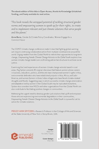 The ebook edition of this title is Open Access, thanks to Knowledge Unlatched funding, and freely available to read online. The COP27 climate change conference in Sharm El Sheikh, Egypt made it clear that fighting global warming will require continuing commitment, cooperation, and collaborative action from multiple constituencies around the world. Urging readers from the Global North to rethink their approaches and potential contributions to long-term change, Empowering Female Climate Change Activists in the Global South explains how woman climate change leaders are confronting patriarchal structures to achieve social justice. Examining the lived experiences of woman climate change activists based in rural areas, Peg Spitzer presents eighty-five original interviews that feature women whose careers in business, education, politics, and the arts have championed women’s rights in Asia, environmental defenders who have established projects in Asia, Africa, and Latin America, and woman farmers in three Indian villages who have faced climate-related droughts and floods. Suggesting ways in which successful climate change amelioration and adaptation led by women in the Global South may be replicated elsewhere, Spitzer also considers how NGOs and other organizations from the Global North can best contribute to facilitating positive changes in the communities where they work by focusing on empathetic cooperation. Addressing the urgent need to develop gender-just solutions that uplift and empower those who are experiencing environmental degradation in their communities, Empowering Female Climate Change Activists in the Global South uncovers the flaws in current combative structures and strategies and re-examines scholarly research at the nexus of feminism, transnational advocacy, and hierarchies of need.