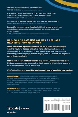 When was the last time you had a real & meaningful conversation? What has happened to our society? Differences of opinion have always been part of life. For decades, spouses, family members, co-workers, and neighbors have had spirited conversations about politics, social issues, religion, current events, and even sports. But what was different in the past is that these disagreements wouldn’t sever ties between family and friends. Today, we live in an argument culture that has let to nearly a third of people reporting they have stopped talking to a friend or family member due to a disagreement and nearly two-thirds of people saying they stay quiet about their beliefs due to the fear of offending others. From cyberbullying to hate speech, workplace harassment, demonizing political language, verbal abuse, and intolerance, the vast majority of us–eighty-seven percent–no longer feel safe in public places to share our opinions. Sean McDowell and Tim Muehlhoff seek to end this stalemate. They believe Christians are called to be God’s ambassadors, which necessarily entails the need to listen to those around us–especially people with diverse and different perspectives. In End the Stalemate, you will be able to revive the art of meaningful conversations by walking through: How to create connection and emotional awareness that opens the door for a fair exchange of ideas and effective communication; How to engage in perspective-taking, as illustrated in Scripture in a number of stories; How to speak the truth in love, from a biblical understanding; How to structure a conversation with those who hold diverse, and/or seemingly threatening, views; and How to honor the words and perspective of those with whom we disagree. Yes, we live in cancel culture. But that doesn’t mean that we as Christians need to conform to our world. Instead, we can be a beacon of sanity that promotes meaningful conversations around what matters most in this life–and the next.