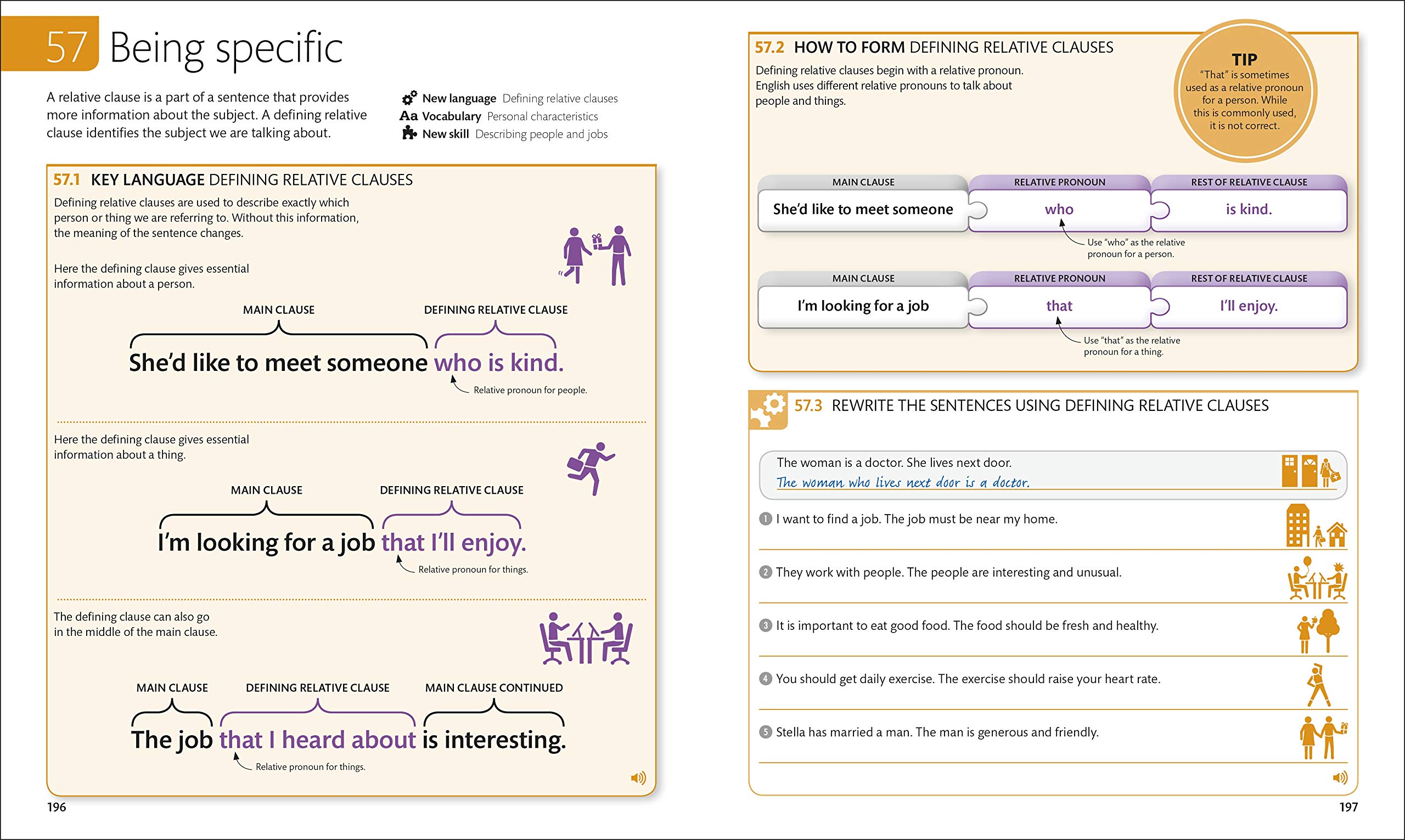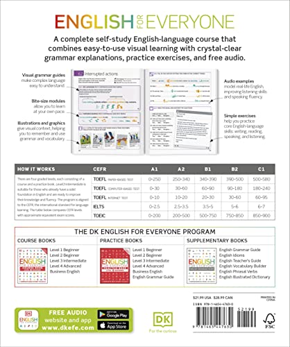 Our Course Book (Level 3) is a great reference guide to introduce English at an intermediate stage including key language skills, grammar, and vocabulary. Ideal for English test preparations or ESL lesson plans, the Course Book uses visual teaching methods to introduce the English language, reinforced through a variety of exercises and examples when used alongside our Practice Book (Level 3). Expand your conversational English in Level 3 by increasing the detail around your interests, life stories, and achievements, as well as being able to give instructions, advice, or solutions to problems. Improve your vocabulary and understanding of grammar rules, to an intermediate level in this comprehensive guide to learning English. Whether you are looking for ESL teaching materials, or a structured program for adults to learn English as a second language, the English for Everyone Course Books provide: – Sample language examples: New language topics are introduced in context using clear, illustrated, and color-coded explanations – Supporting audio: Extensive English-speaking audio materials integrated into every unit, giving vital oral and listening practice. (All supplementary audio is available on the DK English for Everyone website and IOS/Android App). – Sentence formation guides: Visual break downs of English grammar, showing learners how to recreate even complex English sentences – Visual English vocabulary cues: Lists of useful English words and common phrases with visual aids are available throughout the book – Personalized learning: Write-on lines encourage ESL learners to write their own prompts and translations where needed to help customize English language learning The English for Everyone Level 3 resources cover the skills and topics required for all major global English-language exams and reference frameworks including: – CEFR: B1 – lower B2 – TOEFL (test paper): 340-520 – TOEFL (computer-based test): 60-200 – TOEFL (online test): 20-70 – IELTS: 3.5-5.5 – TOEIC: 500-850 English for Everyone is a series of guides and practice books that supports English learning for adults from a beginner level, to intermediate, and advanced practical English. Offering an easy-to-follow format that offers guidance for both teaching English as a second or foreign language, and a self-study approach with resources available to improve English speaking, reading, and writing.