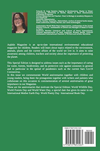 Aquitin Magazine is an up-to-date international environmental educational magazine for children. Readers will learn about topics related to the environment, animals, plants and the current affairs of the world we live in. It aims to raise awareness among children, teachers and society about the importance of protecting the planet. This Special Edition is designed to address issues such as the importance of caring for water, forests, biodiversity, and its protective role against zoonoses in general and in particular in the spread of pandemics such as the current Sars Cov19 Coronavirus. In this issue we commemorate World anniversaries together with children and young readers, being them the protagonists together with writers and painters who collaborate on this occasion in commemoration of several anniversaries of great importance in our Magazine.These are the anniversaries that motivate the Special Edition: World Wildlife Day, World Forests Day and World Water Day, a special date that gives its name to our International Mother Earth Day. World Poetry Day (literary genre that accompanies us and identifies us as an Educational Magazine that bets for the integral teaching of Nature sciences using Literature) International Book Day.