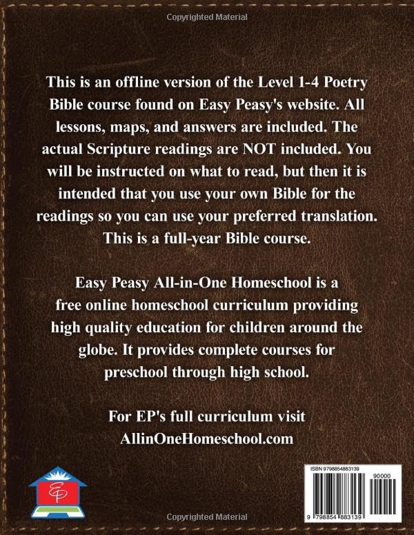 This is an offline version of the Level 1-4 Poetry Bible course found on Easy Peasy’s website. All lessons, maps, and answers are included. The actual Scripture readings are NOT included. You will be instructed on what to read, but then it is intended that you use your own Bible for the readings so you can use your preferred translation. This is a full-year Bible course.