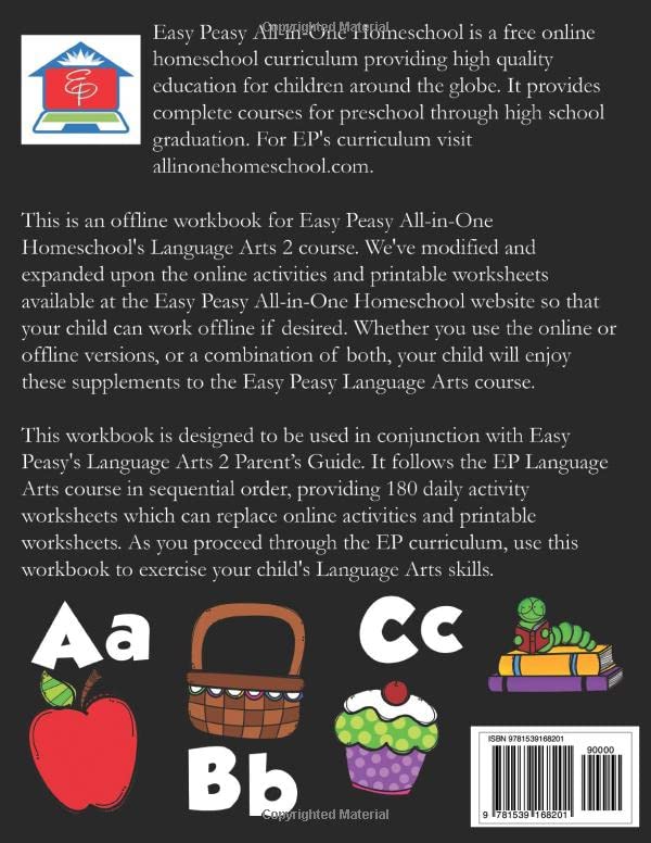 THIS BOOK IS INTENDED TO BE USED WITH THE PARENT’S GUIDE. This workbook only contains the practice, but none of the lessons or teaching concepts. Those (along with spelling lists, assignment explanations, answer keys, and more) will be found in the EP Language Arts 2 Parent’s Guide. (Search Amazon for 1542400597.) Please be sure to purchase and use that book alongside this one. This is an offline workbook for Easy Peasy All-in-One Homeschool’s Language Arts 2 course. We’ve modified and expanded upon the online activities and printable worksheets available at the Easy Peasy All-in-One Homeschool website so that your child can work offline if desired. This workbook follows the EP Language Arts course in sequential order, providing 180 daily activity worksheets which can replace online activities and printable worksheets when combined with the Parent’s Guide. Easy Peasy All-in-One Homeschool is a free online homeschool curriculum providing high quality education for children around the globe. It provides complete courses for preschool through high school graduation.