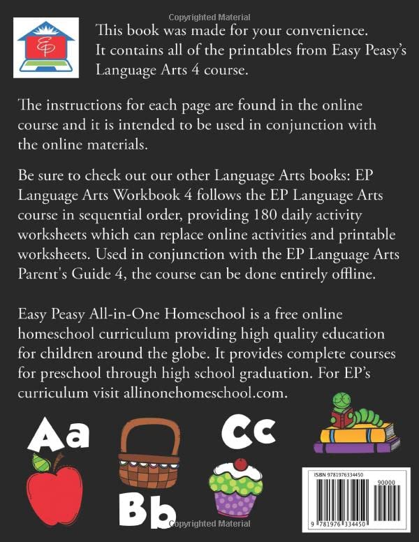 This book was made for your convenience. It is available for printing from the Easy Peasy All-in-One Homeschool website. It contains all of the printables from Easy Peasy’s Language Arts 4 course. The instructions for each page are found in the online course. This is NOT a stand-alone book or course. It cannot be used to be completely offline. It only contains what students are asked to print to use the online course. If you’re looking for offline options, check out the EP store at allinonehomeschool.com/ep-store.Easy Peasy All-in-One Homeschool is a free online homeschool curriculum providing high-quality education for children around the globe. It provides complete courses for preschool through high school graduation. For EP’s curriculum visit allinonehomeschool.com.
