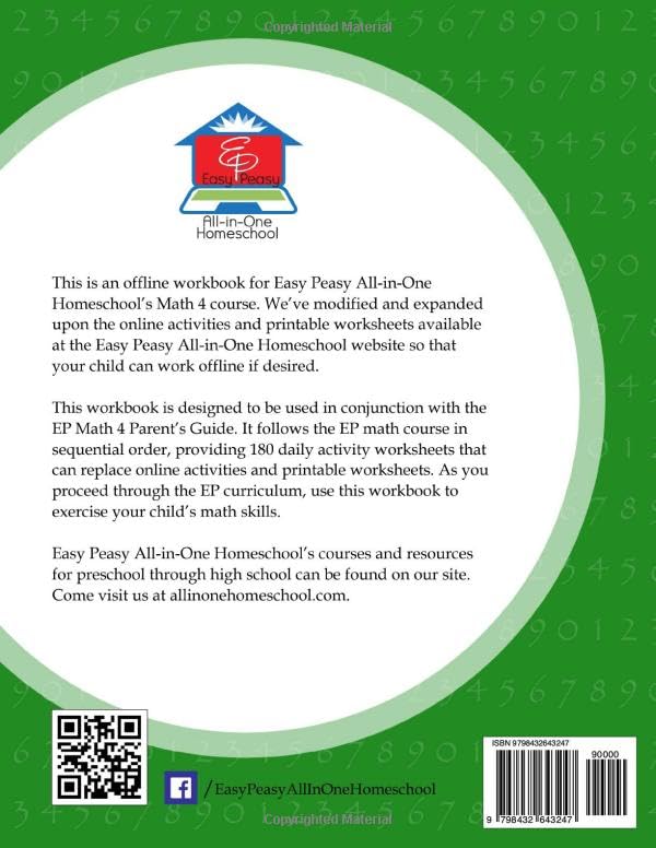 THIS BOOK IS INTENDED TO BE USED WITH THE PARENT’S GUIDE. This workbook only contains the practice, but none of the lessons or teaching concepts. Those (along with answer keys) will be found in the EP Math 4 Parent’s Guide. Please be sure to purchase and use that book alongside this one. This is an offline workbook for Easy Peasy All-in-One Homeschool’s Math 4 course. We’ve modified and expanded upon the online activities and printable worksheets available at the Easy Peasy All-in-One Homeschool website so that your child can work offline if desired. This workbook follows the EP math course in sequential order, providing 180 daily activity worksheets that can replace online activities and printable worksheets when combined with the Parent’s Guide. As you proceed through the EP curriculum, use this workbook to exercise your child’s math skills.