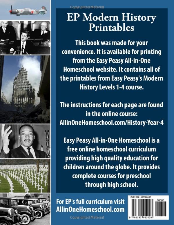 This book is in BLACK & WHITE. This book is for your convenience. It is available for printing from our site. This book contains the sheets you would print if using the online course at Easy Peasy All-in-One Homeschool. This book is for the Levels 1-4 Modern History course. It contains the worksheets as well as the things to print and cut out. All of the timeline pieces used throughout the year that need cutting out are found together at the front of the book. You could try carefully ripping out those pages as you need them. The pages are NOT perforated. This is NOT a stand-alone workbook. It is a companion to the online course. It only contains what students are asked to print to complete the course, including the optional pages.
