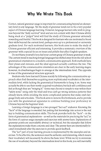 Essential Chinese Grammar is a systematic overview of Chinese grammar, oriented toward self-study, English-speaking students. Through explanations of common mistakes learners make, useful example sentences and exercises with an answer key, this book provides a detailed introduction to the unique grammar structures of the Chinese language. Ideal for any student who is interested in taking their skills to the next level, this book makes the difficult task of perfecting grammar efficient, interesting and rewarding. Essential Chinese Grammar is a perfect tool to help you form correct and natural-sounding sentences, and determine how to best use the grammar you need for reading or writing Chinese. Each example and exercise is written in both pinyin and Simplified Chinese Characters to accommodate learners with varying levels of character literacy, including those who have learned only to speak but not read.