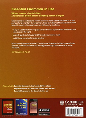 Grammar in Use is the world’s best-selling grammar series for learners of English. Essential Grammar in Use Fourth edition is a self-study reference and practice book for elementary-level learners (A1-B1), used by millions of people around the world. With clear examples and easy-to-follow exercises, this edition without answers is perfect for classroom use, covering all the areas of grammar that learners need at this level. The book has a tried-and-trusted, easy-to-use format of two-page units with clear explanations of grammar points on the left-hand page, and practice exercises on the right. It also includes plenty of additional exercises and a Study Guide to help learners find the grammar units they need to study.