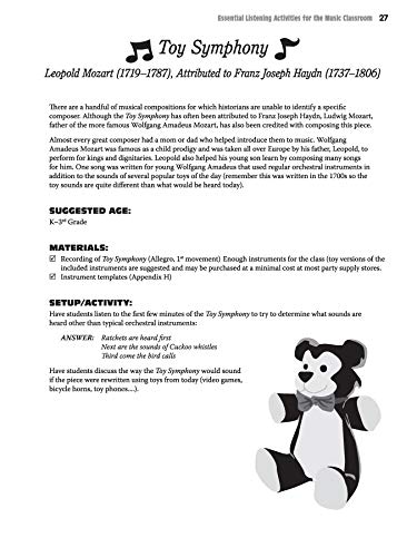 Essential Listening Activities for the Music Classroom is a wonderful supplemental resource for music teachers, homeschool teachers, or general education instructors who wish to incorporate music into their lessons. The enjoyable learning games and activities in this collection, presented in a lesson plan format, have been selected for their ease in instruction and flexibility. Easy-to-use templates are also included for most lessons, along with instructions on making manipulatives to supplement the lessons. The fun and creative lessons range from exploring instrument sounds to learning activities and maps for favorite classical music pieces such as Carnival of the Animals, Pictures at an Exhibition, Also Sprach Zarathustra, and many more! A solid curriculum choice for any elementary classroom, Essential Listening Activities for the Music Classroom will set your students on a path to achieve their musical best!