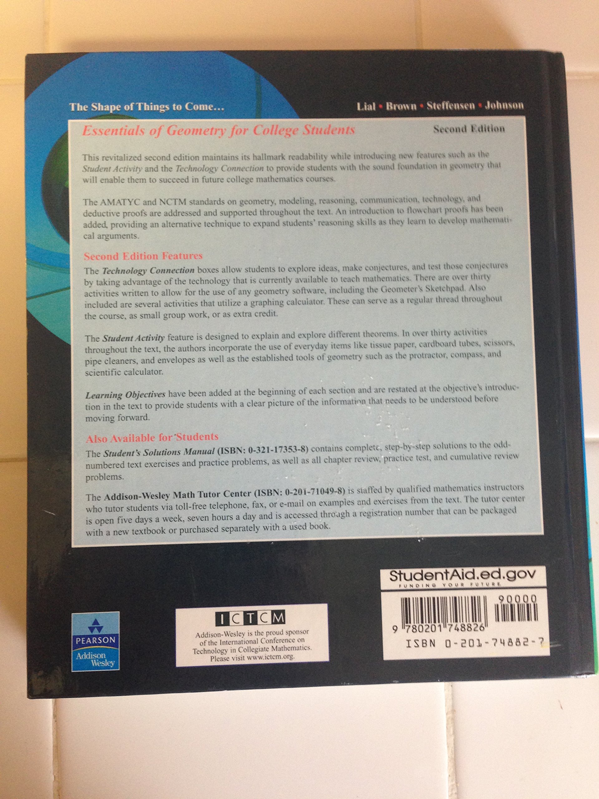 Written for students who need a refresher on Plane Euclidean Geometry, Essentials of Geometry for College Students, Second Edition, incorporates the American Mathematical Association of Two-Year Colleges (AMATYC) and National Council of Teachers of Mathematics (NCTM) Standards on geometry, modeling, reasoning, communication, technology, and deductive proof. To make learning interactive and enjoyable, this new edition includes exciting new features such as Technology Connections and Hands-on Activities. Knowledge of beginning algebra and a scientific calculator are required for this text.