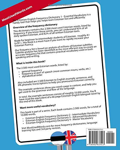 The Core Vocabulary of Estonian With this book, you will learn Estonian fast and efficiently. This book contains practical vocabulary for both spoken and written Estonian. Intended for beginners and intermediate students, this book covers vocabulary roughly from CEFR A1 (complete beginner) to B1 (somewhat able). To help you become fluent fast, each entry in this book contains * English translation(s) * Estonian to English example sentences * IPA phonetic spelling * Detailed Part of Speech information Why Study By Frequency?: Not all words are created equal. Some words are used more than others, and are thus more valuable to know. The secret to becoming fluent fast in a language, is by learning the right vocabulary. Studies have shown that the most used 2.500 words account for 92% of all spoken Estonian, and 82% of all written Estonian text. How Much Vocabulary Do You Need To Know? While it’s important to note it’s impossible to pin down these numbers and statistics with 100% accuracy, these are a global average of multiple sources. According to scientific research, this is the amount of vocabulary needed for varying levels of fluency: * 250 words: the essential core of a language. Without these words, you cannot construct sentences. * 750 words: those that are used every single day by every person who speaks the language. * 2,500 words: those that should enable you to express everything you could possibly want to say, although some creativity might be required. * 5,000 words: the active vocabulary of native speakers without higher education. You will understand about 90% of all written text. * 10,000 words: the active vocabulary of native speakers with higher education. * 20,000 words: the amount you need to recognize passively in order to read, understand, and enjoy a work of literature such as a novel by a notable author. Keeping above facts in mind, the value of a frequency dictionary is immense. At least, if you want to become fluent in a language fast. Study the most frequent words, build your vocabulary and progress naturally. What is Inside This Book? A frequency list of the most frequently used Estonian words, based on analysis of a huge amount of Estonian subtitles. A large base text collection is absolutely vital in order to establish a reliable general frequency list. Subtitles have the advantage of corresponding both to written and spoken language. This makes subtitles the best method for creating a useful and practical word frequency list. This Estonian to English frequency dictionary can roughly be divided in three parts. * 2.500 Estonian words in ranked by general frequency * Frequency ranking by part of speech (E.G, the most used adjectives, nouns, verbs, etc) * 2.500 Estonian words in alphabetical order Estonian pronunciation can be tricky. To help you pronounce Estonian words correctly, we added phonetic transcriptions of Estonian words. We used the International Phonetic alphabet for phonetic spelling. Summary The Estonian Frequency Dictionary – Essential Vocabulary gives you a practical word list to learn Estonian vocabulary. Study the most used words to rapidly gain a base vocabulary in Estonian. These high-frequency words are a great tool for beginners and intermediate students. The frequency dictionary can be used as a stand-alone tool, or in combination with any other language learning program, app or book. This book roughly covers CEFR vocabulary ratings from A1 (absolute beginner) to B1 (somewhat proficient). Invest this book, and invest in yourself. You will amaze yourself, your friends and your family by how fast you’re progressing in your journey of speaking Estonian.