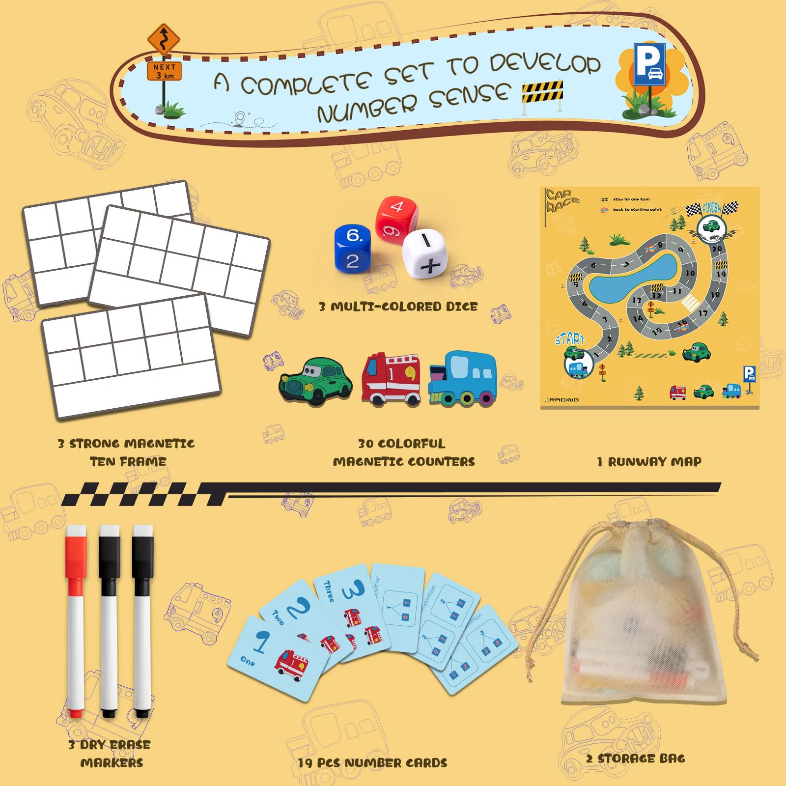 - Magnetic Ten Frame Set: This set of magnetic math manipulatives features 3 lasting frames (10.1×6.1in), 10 car counters for kids math in each color (blue, green, red), 1 runway game map (15.75×15.75in), 3 dry erase markers, 19 number cards, 3 dice, 1 product manual, 1 runway game map instruction guide, and 2 drawstring portable storage bags.