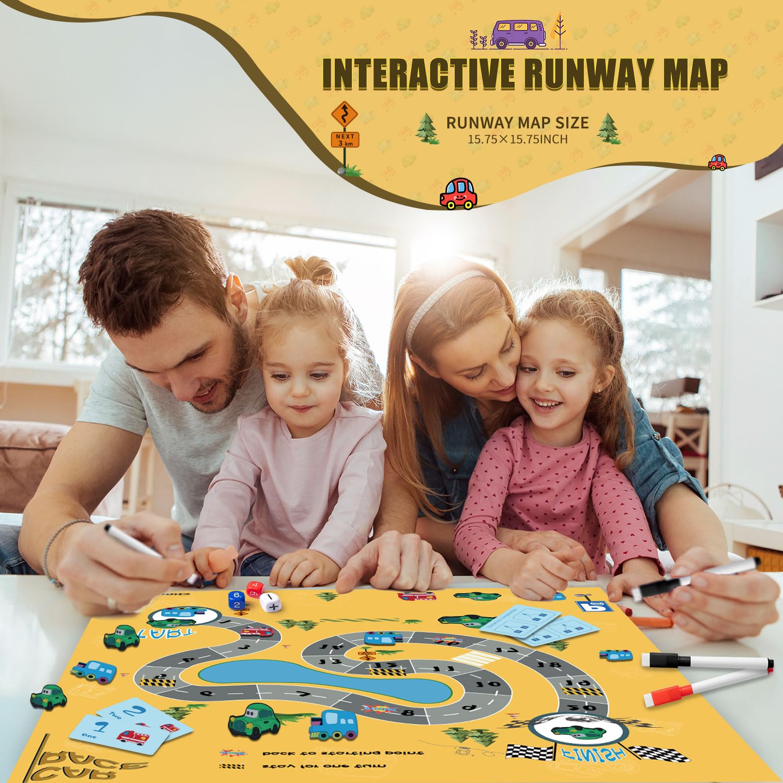 - Runway Map Race Toy: The math manipulatives set includes a runway race game that can increase interactivity through play-based learning. According to the game rules, players take turns rolling the dice and moving their cars along the track. The first player to reach the finish line wins. This game helps cultivate children’s interest in learning mathematics through an engaging, hands-on experience that reinforces number sense and place value concepts.