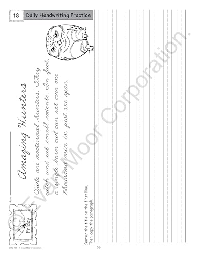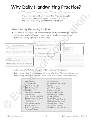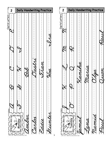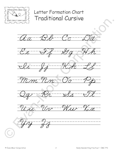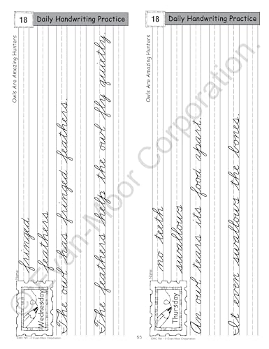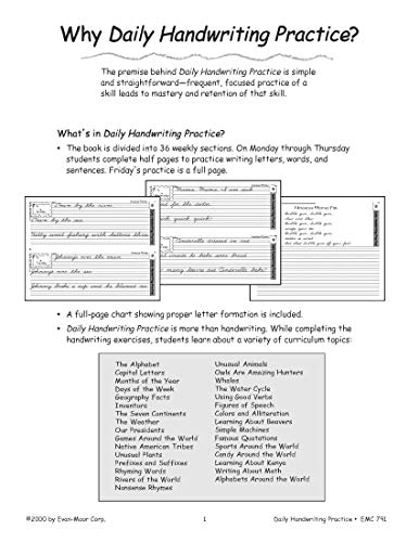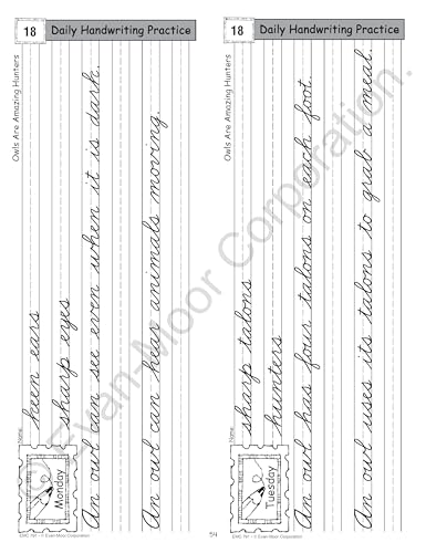 Daily Handwriting Practice, Traditional Cursive is more than just a handwriting book; it is a learning tool that helps developing young minds practice basic skills in an interesting and unique way. For example, on the topic “What Is Work?” students learn about simple tools and the physics applied in using them. Students write letters, words, and sentences about a variety of content-area topics appropriate for the classroom. Monday through Thursday, the weekly subjects for writing exercises range from famous inventors to famous quotations and from amazing hunters to the water cycle. On Friday, a full-page exercise draws the topic to a close by reviewing what was learned earlier that week. This book is a useful and effective teaching tool because each letter is introduced and practiced before students are asked to use it. Curriculum topics addressed include: the alphabet capital letters rhyming words months of the year days of the week world alphabets geography facts synonyms nonsense rhymes color words alliteration U.S. presidents simple machines math rhyming words prefixes and suffixes Skills reinforced that help keep handwriting legible include: correct letter formation letter placement spacing between letters spacing between words