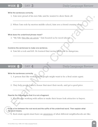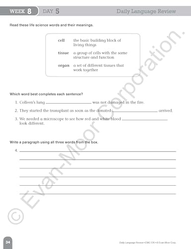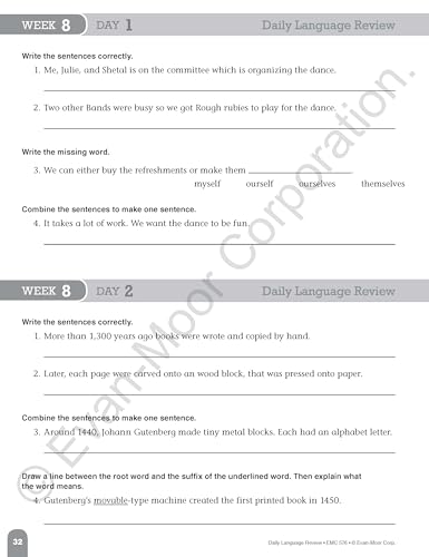 Evan-Moor Daily Language Review Workbook for grade 6 renders five items for every day of a 35-week school year, presented in a standardized-testing format. Book of 112 pages help to keep your students sharp in skills like sentence editing, vocabulary, grammar, punctuation, reference and word study. Book comes with scope-and-sequence charts, suggestions for use and answer keys for the teachers.