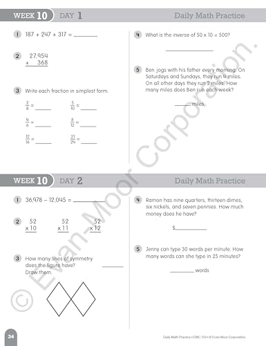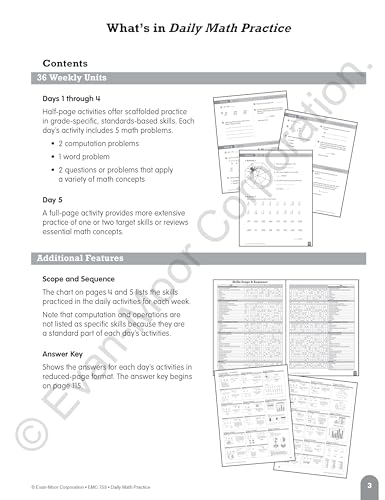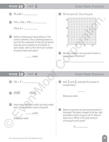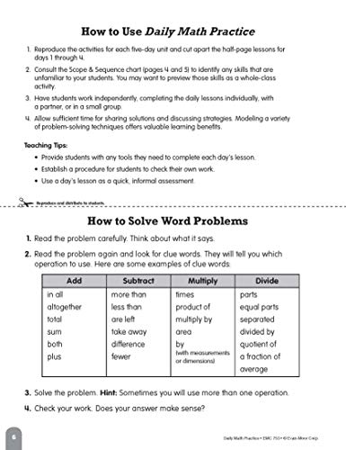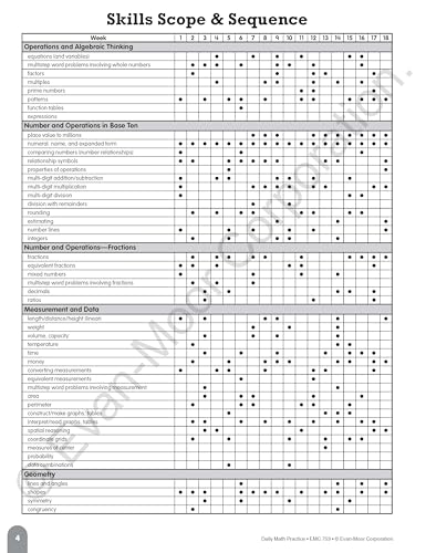 Evan-Moor Daily Math Practice Book for grade 4 provides 10-to-15 minutes of daily math practice. It helps to keep skills sharp with focused practice presented in standardized testing formats. This book has 112 pages and comes with a 36 week progressive program along with scope, sequence charts and answer keys.