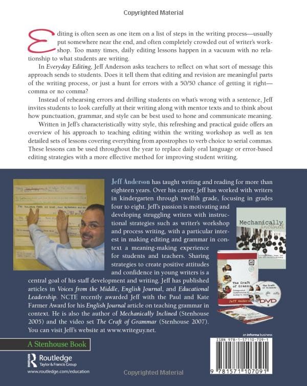 Editing is often seen as one item on a list of steps in the writing process, usually put somewhere near the end, and often completely crowded out of writer’ s workshop. Too many times daily editing lessons happen in a vacuum, with no relationship to what students are writing. In Everyday Editing , Jeff Anderson asks teachers to reflect on what sort of message this approach sends to students. Does it tell them that editing and revision are meaningful parts of the writing process, or just a hunt for errors with a 50/50 chance of getting it right,comma or no comma? Instead of rehearsing errors and drilling students on what’ s wrong with a sentence, Jeff invites students to look carefully at their writing along with mentor texts, and to think about how punctuation, grammar, and style can be best used to hone and communicate meaning. Written in Jeff’ s characteristically witty style, this refreshing and practical guide offers an overview of his approach to editing within the writing workshop as well as ten detailed sets of lessons covering everything from apostrophes to serial commas. These lessons can be used throughout the year to replace Daily Oral Language or error-based editing strategies with a more effective method for improving student writing.