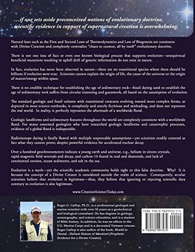 This is an easy-to-read, comprehensive and compelling review of scientific evidence for Divine Creation loaded with color photos and illustrations. This book is described as a tour de force which strongly refutes the notion that science supports the evolution/long age view. It clearly shows that evolutionary doctrine is not based on known scientific laws or the preponderance of scientific evidence but rather, it is built on false assumptions and poor science. Scientific creation, as described in the Book of Genesis, is perfectly consistent with all known scientific laws and evidence, and the evidence is overwhelming and supports the reality of a worldwide flood and a young earth. This full-color book was written for the high school and college student, the general public, and the professional scientist and for parents who need help refuting evolution for their children.