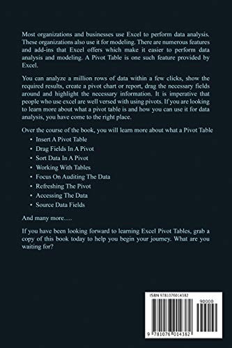 Most organizations and businesses use Excel to perform data analysis. These organizations also use it for modeling. There are numerous features and add-ins that Excel offers which make it easier to perform data analysis and modeling. A Pivot Table is one such feature provided by Excel. You can analyze a million rows of data within a few clicks, show the required results, create a pivot chart or report, drag the necessary fields around and highlight the necessary information. It is imperative that people who use excel are well versed with using pivots. If you are looking to learn more about what a pivot table is and how you can use it for data analysis, you have come to the right place. Over the course of the book, you will learn more about what a Pivot Table: Insert A Pivot Table Drag Fields In A Pivot Sort Data In A Pivot Working With Tables Focus On Auditing The Data Refreshing The Pivot Accessing The Data Source Data Fields And many more…. If you have been looking forward to learning Excel Pivot Tables, grab a copy of this book today to help you begin your journey. What are you waiting for?