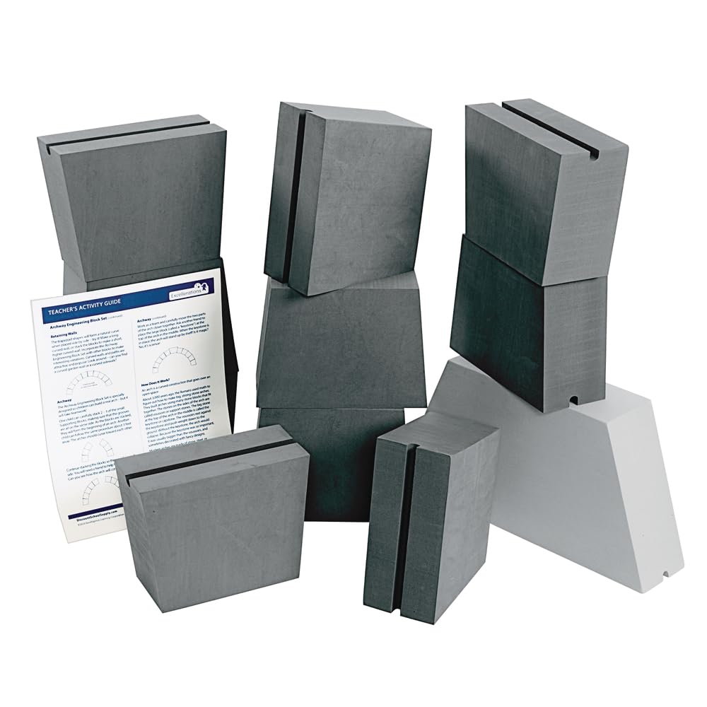 Set of 10 trapezoid-shaped supporting blocks and 1 keystone block may be used to build unique towers, naturally curving retaining walls, crenellated castle walls, and a real self-standing arch big enough to crawl through. Supporting blocks have a groove on the outside edge to help kids align arch. Included guide provides building ideas, step-by-step arch directions, and history and modern uses of arches. Convenient vinyl storage bag.