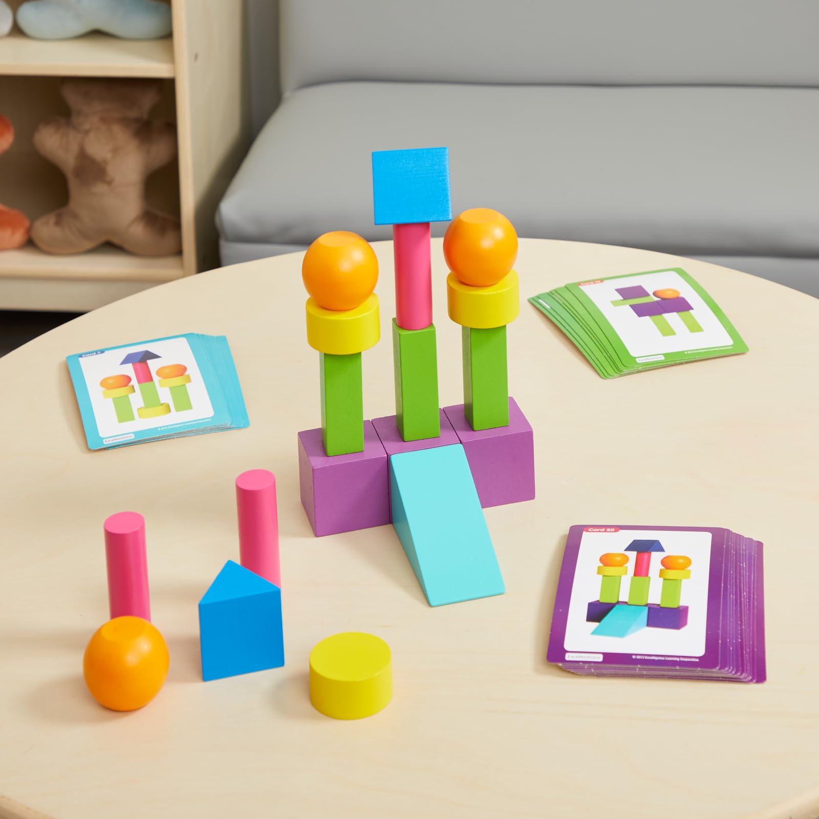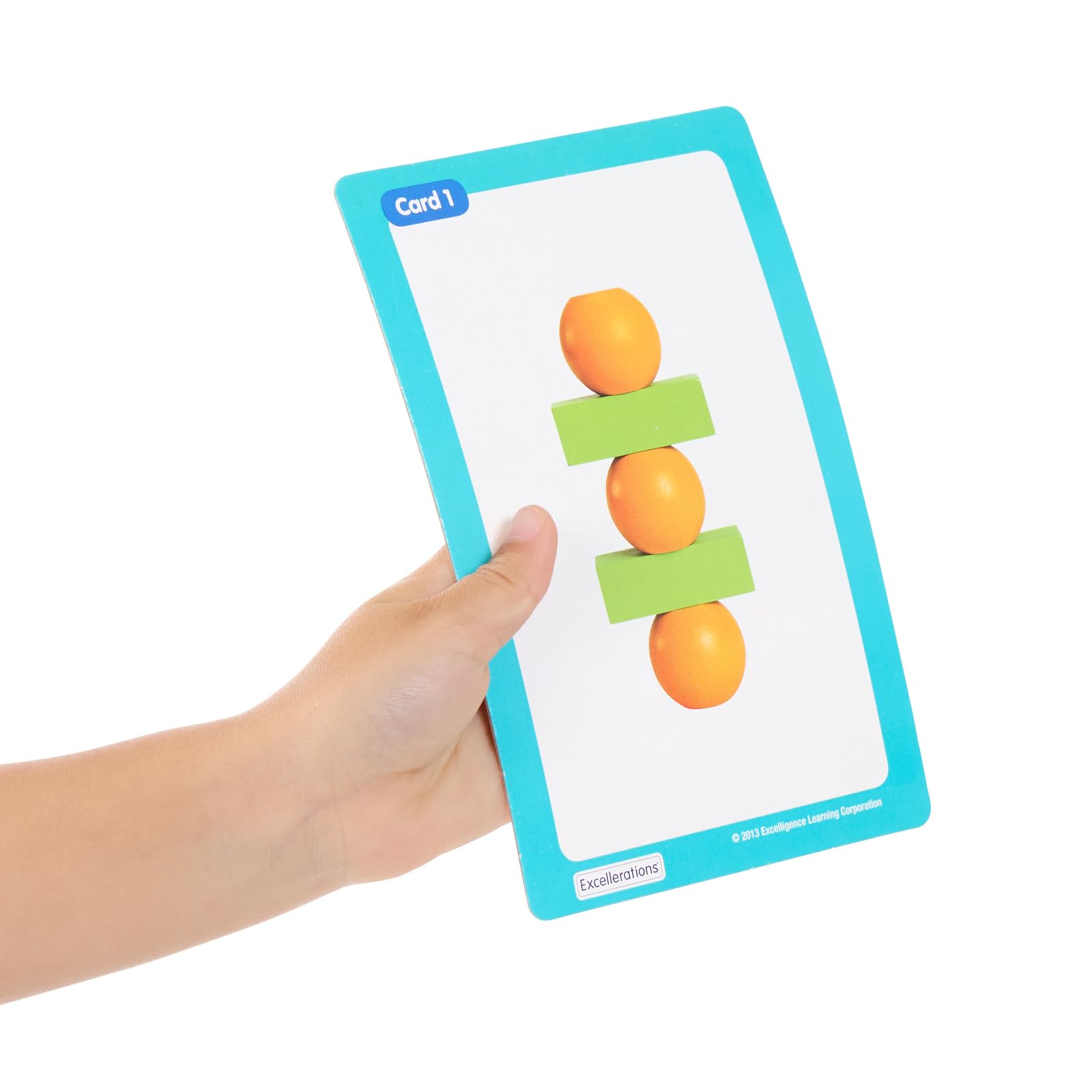 - EDUCATIONAL: The basic, recognizable shapes in visually-stimulating colors invite exploration and discussion. Pattern cards in 3 skill levels provide opportunities for children to construct 3-D structures from 2-D photographs