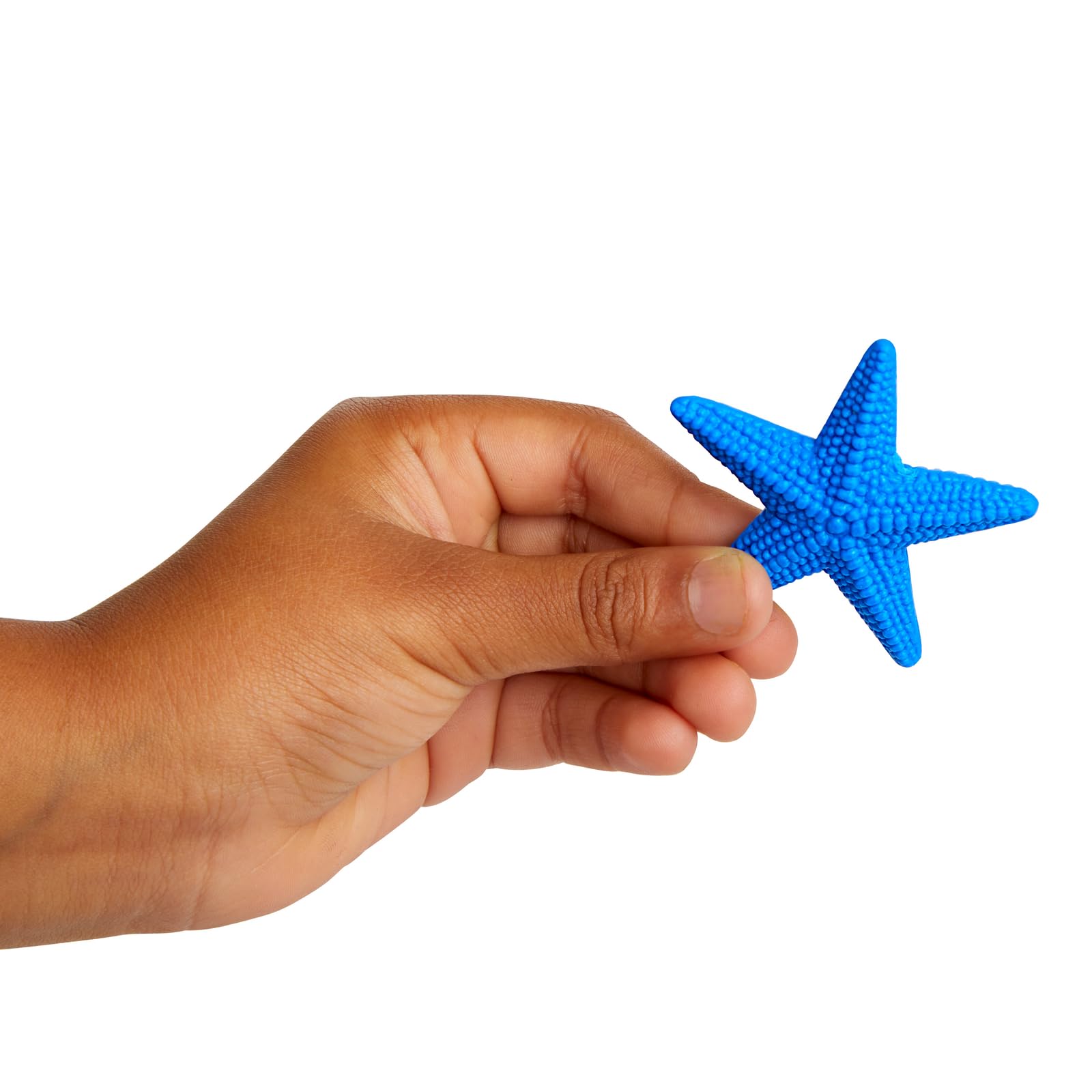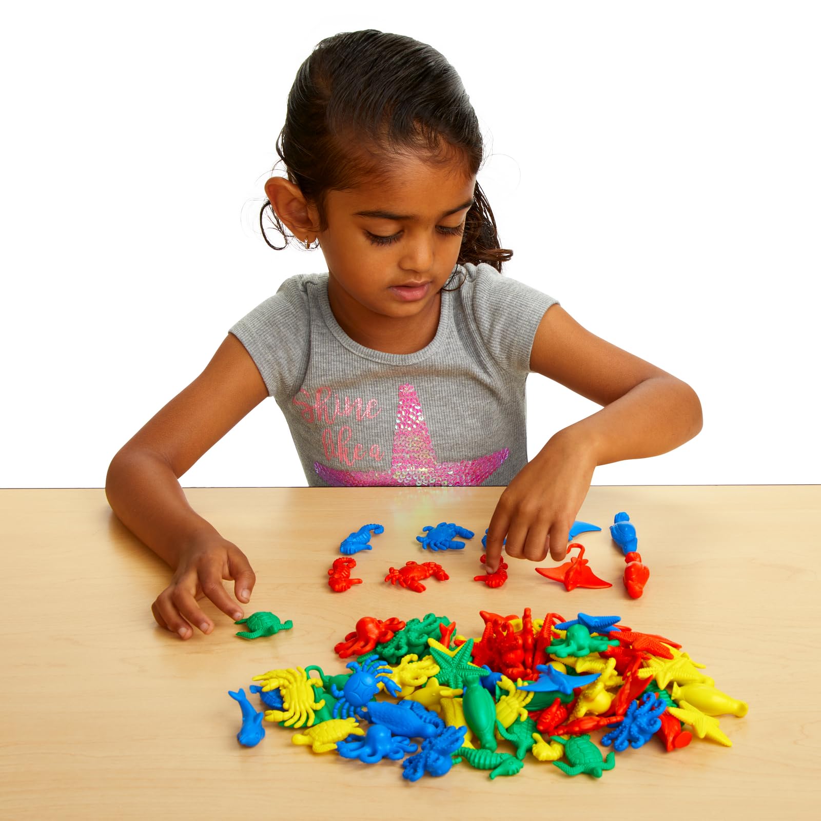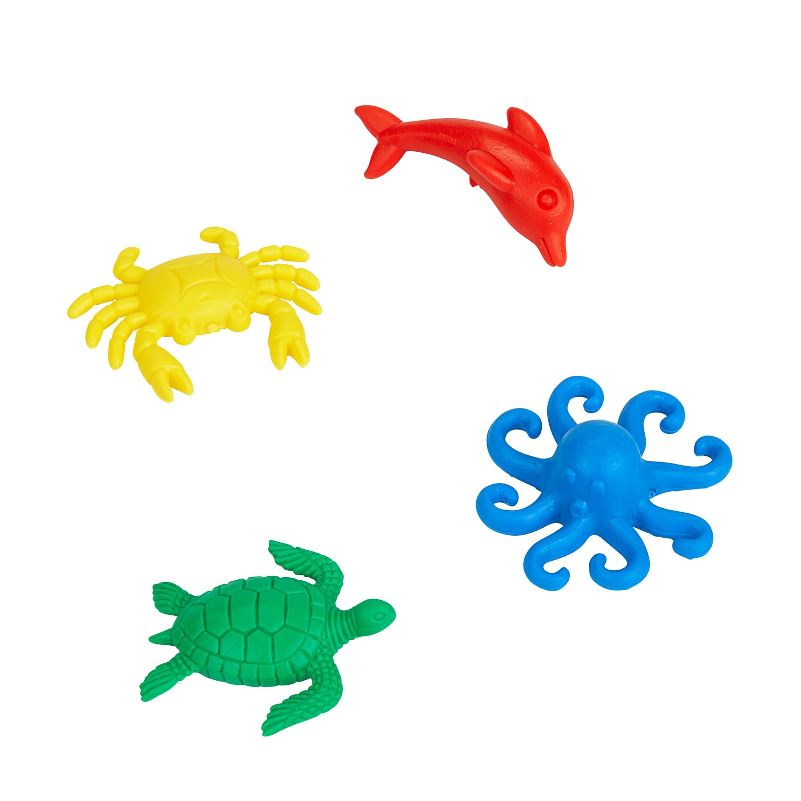 Dive into math! 128 flexible, rubber counter set has 4 each of 8 sea creatures. Includes: star fish, crab, octopus, sea turtle, Penguin, Dolphin, Stingray and seahorse. (Teach counting, sorting, patterning and one-to-one Correspondence; introduce the Ocean and a variety of sea life; smallest counter (turtle) measures 1-3/4″; largest counter (Stingray) measures 2-1/2″; 4 colors: Blue, green, red and yellow; storage jar included) – discount school supply item # UNDER.