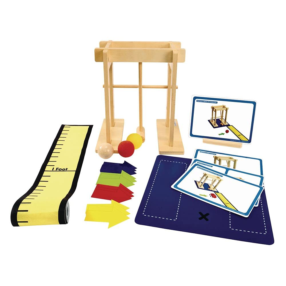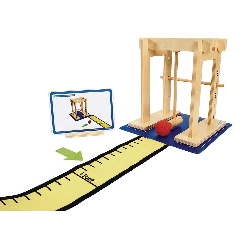 - SET INCLUDES: Includes easy-to-assemble Force Generator, launch mat, 12 placement arrows, 3 balls (wood, soft foam, dense foam), 4 activity cards with stand, teacher’s guide and 15′ tape measure.