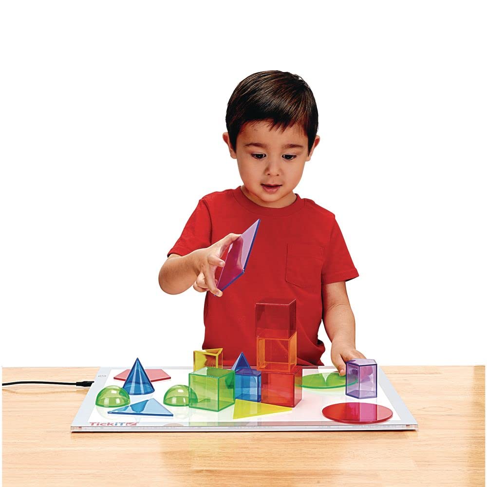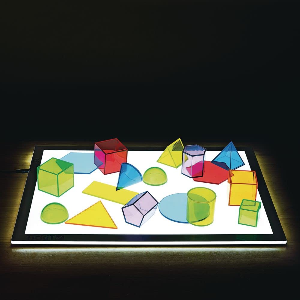 Lighten up math lessons with these illuminating shapes! This colorful 71-piece set of translucent geometric shapes will help kids learn about 2- and 3-dimensional objects, spatial relations and size–all while exploring the interaction between lights, colors and shapes. Translucent, hollow cubes come in 3 sizes and 5 different colors. Bins measures 6-1/4 inches W x 6-1/4 inches L x 4-1/2 inches D.Matching Geo Solids Colors are blue, green, orange, red and yellow. 15 cubes come complete with 10 double-sided activity cards and a storage bin. Cubes measure 1-1/4 square inches, 1-1/2 square inches and 2 square inches.Translucent Attribute Shapes 6 translucent basic attribute shapes in 6 colors and have endless combinations for matching and creating patterns. 36 shapes come with 10 double-sided activity cards in a storage bin. Shapes include circle, hexagon, pentagon, rectangle, triangle and square. Colors include blue, green, orange, purple, red and yellow. Largest measures 4 square inches 1/8 inches thick. Smallest measures 3-3/4 inches L x 1-3/4 inches W x 1/8 inches H. Bin measures 6-1/4 inches W x 6-1/4 inches L x 4-1/2 inches D.