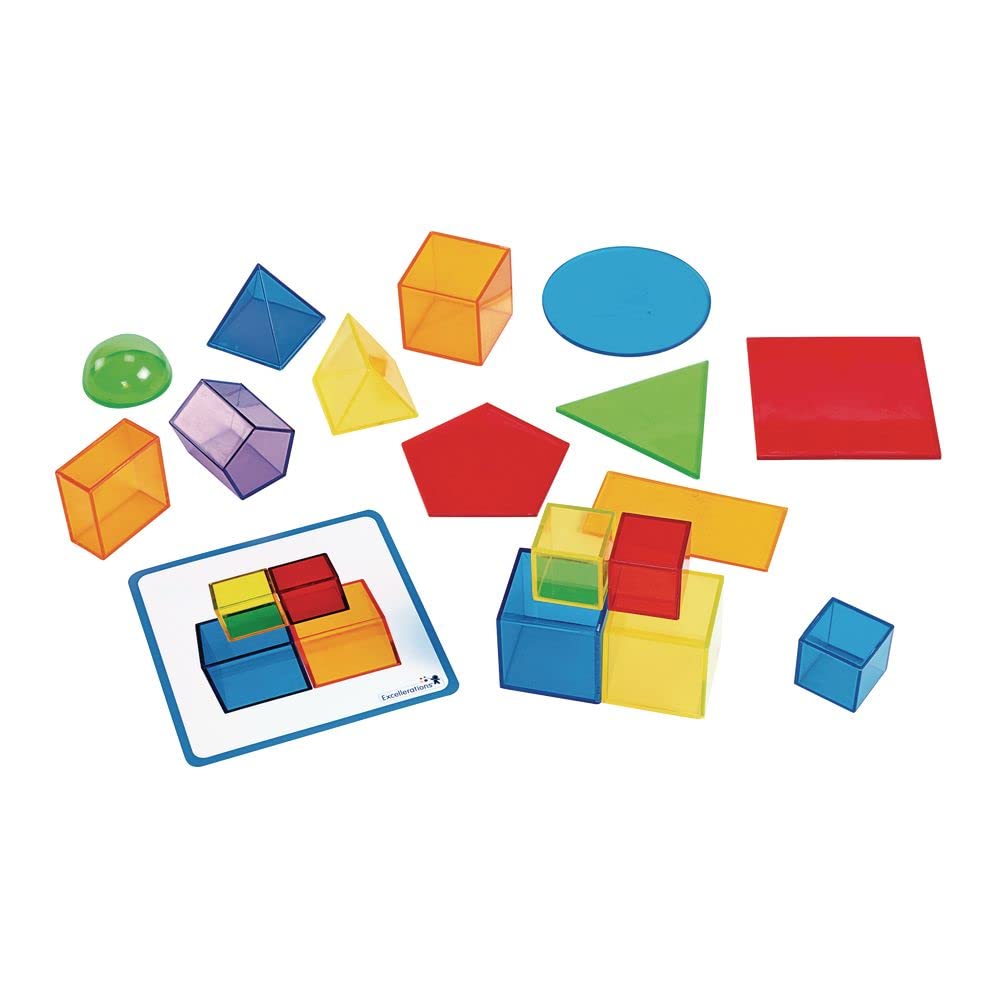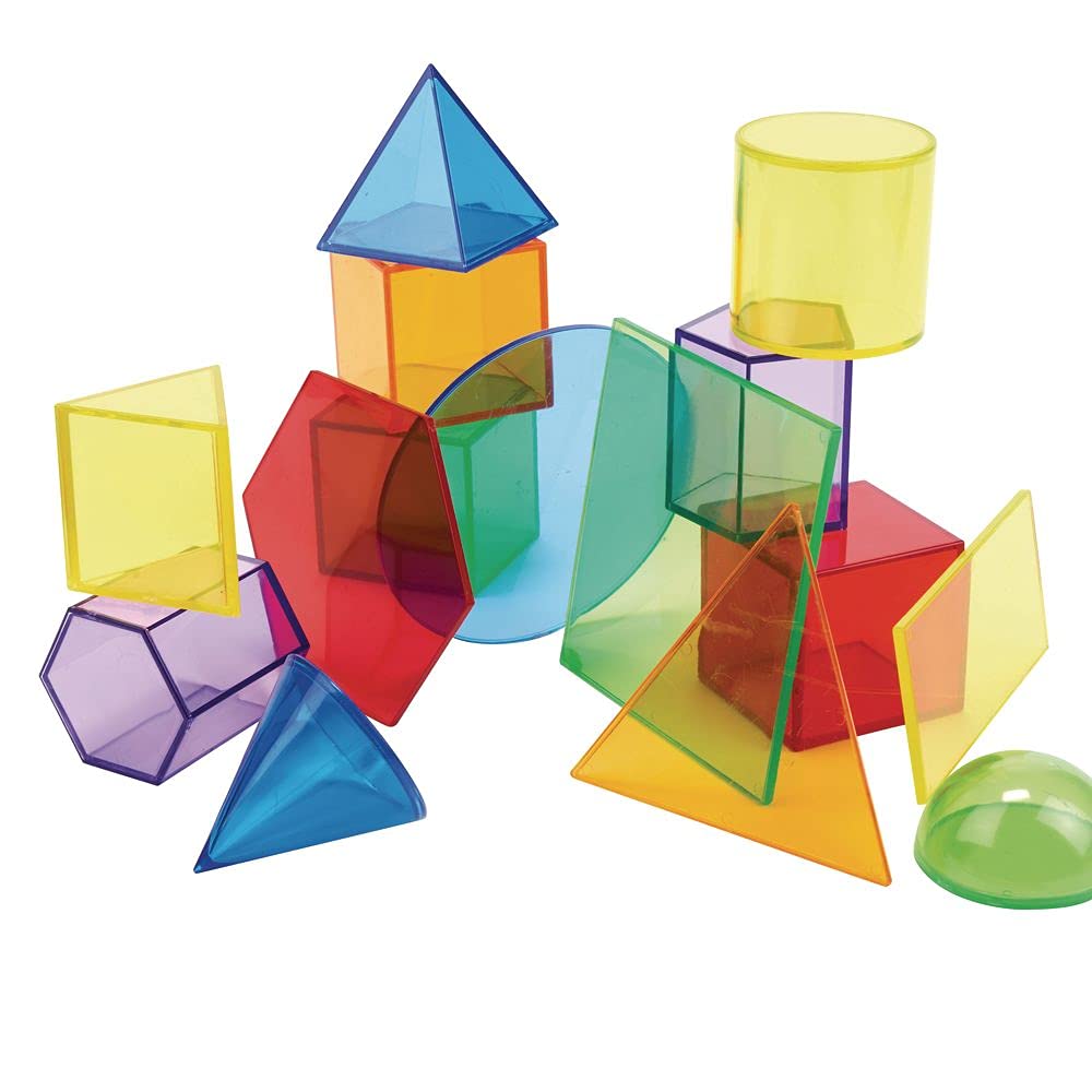 • Pieces include 2 each of hemisphere, cylinder, cube, triangular pyramid, square-based pyramid, cone, pentangular prism, rectangular prism, square-based prism and hexagonal prism.Translucent Cubes Set