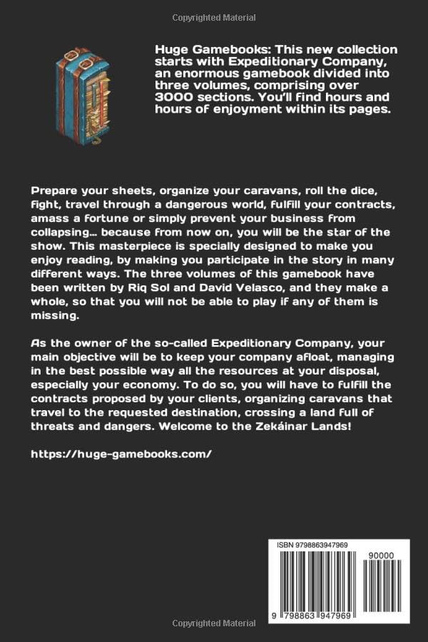 – Warning: Please note that all three books comprising Expeditionary Company are mandatory for gameplay. You cannot play with just one or two; you will use all three simultaneously, navigating among them. – DISCLAIMER. Regarding the English translation of Expeditionary Company, you have to take into consideration that it has been done by Riq Sol, one of the authors. Even though he has put in all his commitment and passion to make it as good as possible, and he has a certified C2 level in English (a Proficiency level for Cambridge University), Riq is not a native speaker and he will inevitably make mistakes in the translation. We believe it is fully understandable and the quality is adequate enough to play with the material without mix-ups, but, please, don’t expect it to be perfect. The authors are very concerned about making this clear, so that no one has expectations that are not met. Please check the level of the translation yourself by reading the rules (visit our website) –or even this disclaimer– to decide if it’s good enough for you. Our greatest wish is to reach as wide an audience as possible, this huge gamebook deserves it, but we don’t want to disappoint any reader either. Visit our website! https://huge-gamebooks.com/ There, you’ll find a plethora of downloadable materials, including maps and all the sheets necessary for gameplay. Additionally, you can enjoy the Original Soundtrack of Expeditionary Company, various game modes designed for two players, supplements, informative videos on caravan travel, and a multitude of other surprises. To add to the excitement, you can connect with the authors through multiple channels and social networks, such as Telegram, Discord, Facebook, Instagram, or YouTube. Join our community; we eagerly anticipate your participation! Huge Gamebooks: This new collection starts with ‘Expeditionary Company’, an enormous gamebook divided into three volumes, comprising over 3000 sections. You’ll find hours and hours of enjoyment within its pages. It’s more than just a gamebook; it’s a parallel life. Prepare your sheets, organize your caravans, roll the dice, fight, travel through a dangerous world, fulfill your contracts, amass a fortune or simply prevent your business from collapsing… because from now on, you will be the star of the show. This masterpiece is specially designed to make you enjoy reading, by making you participate in the story in many different ways. The three volumes of this gamebook have been written by Riq Sol and David Velasco, and they make a whole, so that you will not be able to play if any of them is missing. As the owner of the so-called Expeditionary Company, your main objective will be to keep your company afloat, managing in the best possible way all the resources at your disposal, especially your economy. To do so, you will have to fulfill the contracts proposed by your clients, organizing caravans that travel to the requested destination, crossing a land full of threats and dangers. You must not read the books in the usual way, but rather follow the indications that you will find in their pages, which will make youjump from either one book to another (‘Travel Guide’, ‘Contract Ledger’ and ‘Zekainar Manual’) or from one section of one book to another section of the same book. You will be able to start as many times as you want, to discover the multiple tests you will have to face, as the text contains a great deal of choices that can determine the success or failure of your mission… Welcome to the Zekainar Lands! https://huge-gamebooks.com/