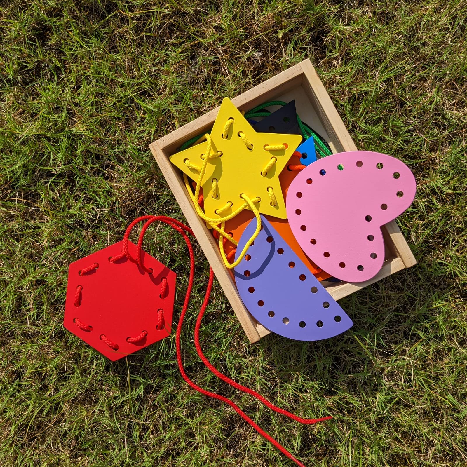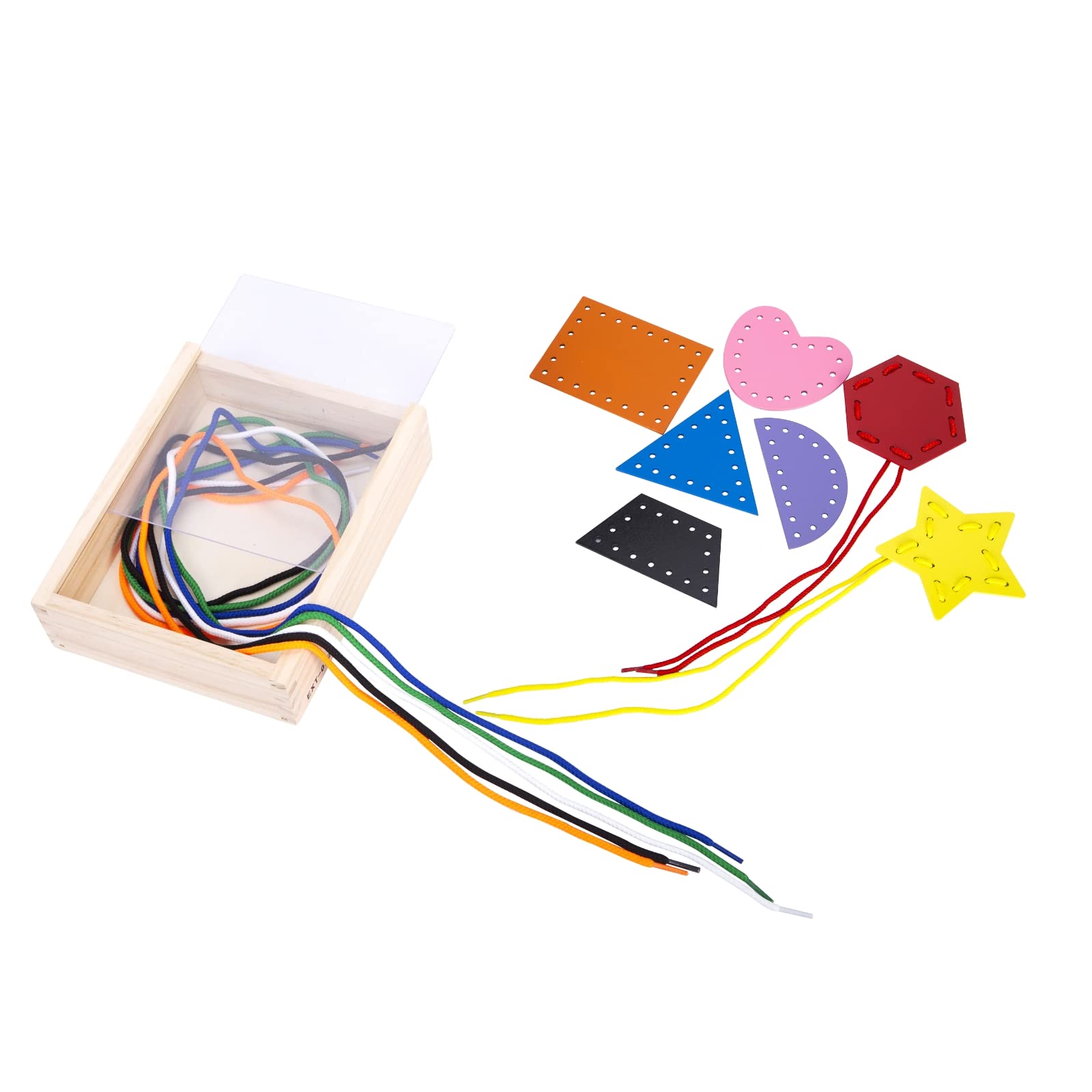 LACE AND TRACE – This wooden set contains 7 double-sided lacing panels and 7 color-coordinated laces, it’s ideal to practice fine motor skills and fun geometric lacing.