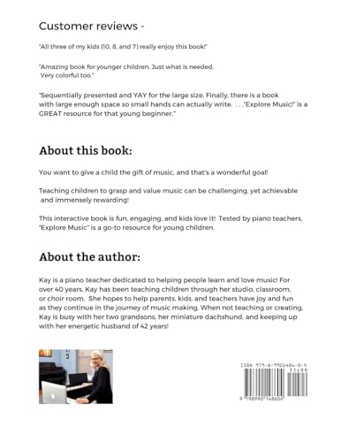 This is the updated 2nd edition of “Explore Music.” With even more input from students and piano teachers, this edition is even more helpful. (Note: to see sample pages, scroll down to the “From the Publisher” section.) Giving kids the gift of music is a wonderful goal! Teaching children to grasp and value music can be challenging, yet achievable and immensely rewarding! I provide resources to help parents and teachers have EASY and FUN ways to help kids in their musical journey. Unlocking the joy of music for young minds has never been more delightful! With this engaging workbook, the child will embark on a journey of discovery, making learning an experience they will enjoy. This book contains captivatingly cute lessons that young kids love! Engaging exercises and activities are included and the pages are beautifully illustrated. Containing clear and concise instructions, “Explore Music” is designed for young learners aged 4-7. This workbook is not just a learning tool; it’s an investment in a child’s future. By introducing them to the language of music at an early age, you are equipping them with a lifelong skill that will bring joy and skill. Whether a child aspires to play an instrument or simply wants to appreciate music more deeply, this workbook will be a guide on their musical journey. *This book uses American terminology for rhythm.