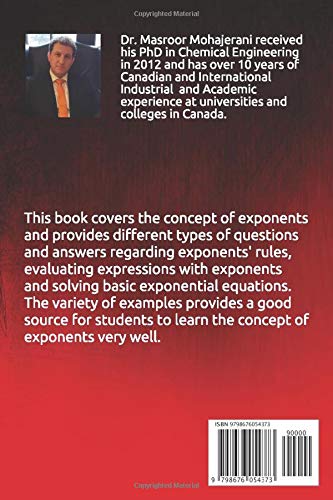 This book covers the concept of exponents and provides different types of questions and answers regarding exponents’ rules, evaluating expressions with exponents, and solving basic exponential equations. The variety of examples provides a good source for students to learn the concept of exponents very well. Learn and practice Algebra and Improve your skills in MathYou will learn:- Concept of Exponents in Algebra- Evaluating Exponential expressions in Mathematics- Simplifying Exponential expressions- Evaluating Exponential expressions including fractional exponents- Evaluating and Simplifying fractional exponents- Evaluating and Simplifying negative exponents- How to evaluate exponential expressions with negative or fractional exponentsYou will learn mathematics and all its subfields such as algebra and calculus by solving different questions by yourself. In the book, there are lots of different examples to help you to improve your math skills. This Math workbook helps students to find any kind of algebra questions and learn the skills to solve them.