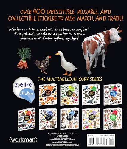 Over 400 irresistible, reusable, and collectible stickers to mix, match, and trade! Part of the bestselling Eyelike Stickers series, Eyelike Stickers:On the Farm is perfect for animal-lovers and crafters alike! The full-color photographic stickers feature cute farm animals like lambs, pigs, horses, ducks, and more, plus a vibrant variety of farm-fresh fruits and veggies. Whether on windows, notebooks, lunch boxes, or scrapbooks, these peel-and-place stickers are perfect for creating your own work of art anytime, anywhere, and are designed to be stuck on, peeled off, and stuck on again without tearing or losing their “stick.” The books’ inside covers are glossy illustrated backgrounds on which kids can create lively and original sticker scenes–and then change them whenever they like.