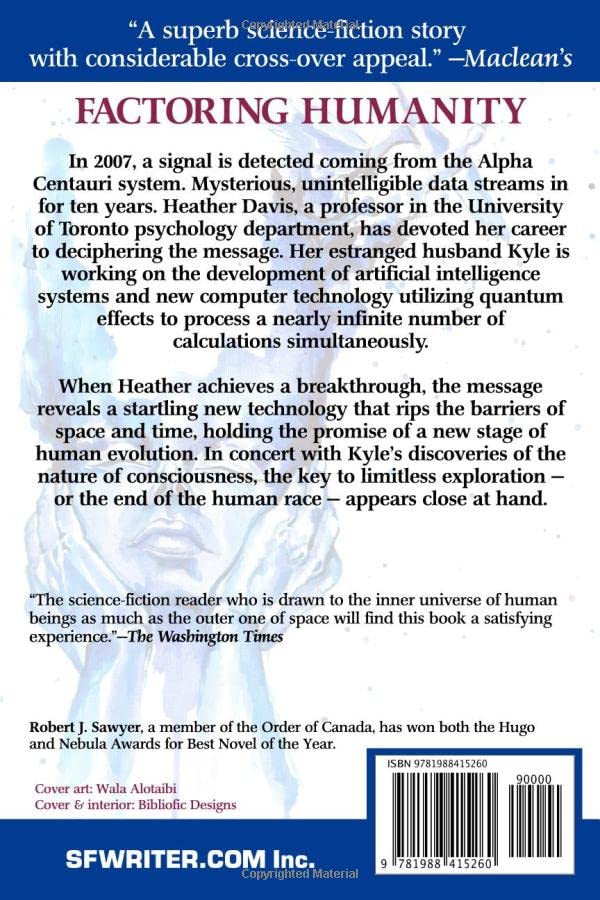 Hugo Award finalist! In 2007, a signal is detected coming from the Alpha Centauri system. Mysterious, unintelligible data streams in for ten years. Heather Davis a professor in the University of Toronto psychology department, has devoted her career to deciphering the message. Her estranged husband, Kyle, is working on the development of artificial intelligence systems and new computer technology utilizing quantum effects to produce a near-infinite number of calculations simultaneously. When Heather achieves a breakthrough, the message reveals a startling new technology that rips the barriers of space and time, holding the promise of a new stage of human evolution. In concert with Kyle’s discoveries of the nature of consciousness, the key to limitless exploration — or the end of the human race — appears close at hand. This edition includes a reading group guide. ROBERT J. SAWYER has won the Hugo, Nebula, John W. Campbell Memorial, Seiun, and Aurora Awards, all for best science fiction novel of the year. His novels include Hominids, Rollback, Wake, The Oppenheimer Alternative, and FlashForward (basis for the ABC TV series).