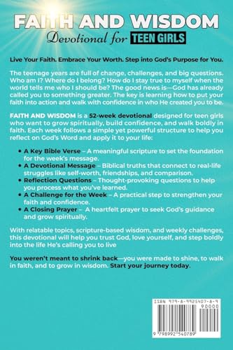 A Devotional for Teen Girls Who Want to Grow in Confidence, Strength, and Faith You were created with purpose–are you ready to embrace it? Life as a teen can feel overwhelming. Between school, friendships, social pressures, and figuring out who you are, it’s easy to feel lost or uncertain. But here’s the truth: God has created you with love, wisdom, and strength–He’s calling you to walk boldly in faith. Faith and Wisdom is a 52-week devotional designed to help teen girls grow spiritually, build confidence, and trust God in every season of life. This isn’t just about reading Bible verses–it’s about applying God’s truth, discovering your worth in Him, and stepping into the person He created you to be. Each week, you’ll be guided through five key sections: A Key Bible Verse – Start with a meaningful scripture that sets the foundation for the week’s message. A Devotional Message – Explore real-life topics like self-worth, comparison, friendships, inner strength, and trusting God’s plan. Reflection Questions – Dig deeper with thought-provoking questions that help you process and apply what you’ve learned. A Challenge for the Week – Take action with a practical, faith-building challenge that strengthens your confidence and character. A Closing Prayer – End with a heartfelt prayer to seek God’s wisdom and grow in your faith. This interactive devotional is more than just reading–it’s about living out your faith. With relatable lessons, engaging questions, and weekly challenges, you’ll learn how to: Trust God’s plan even when things feel uncertain. Find your worth in Christ instead of seeking validation from the world. Develop confidence and wisdom to make choices that reflect your faith. Strengthen your relationships with family, friends, and God. Live with joy and purpose knowing you are loved, chosen, and called. No matter where you are in your faith journey, Faith and Wisdom will challenge, inspire, and equip you to grow spiritually and take bold steps toward becoming the young woman God created you to be. Are you ready to grow in faith and wisdom? Start your journey today!