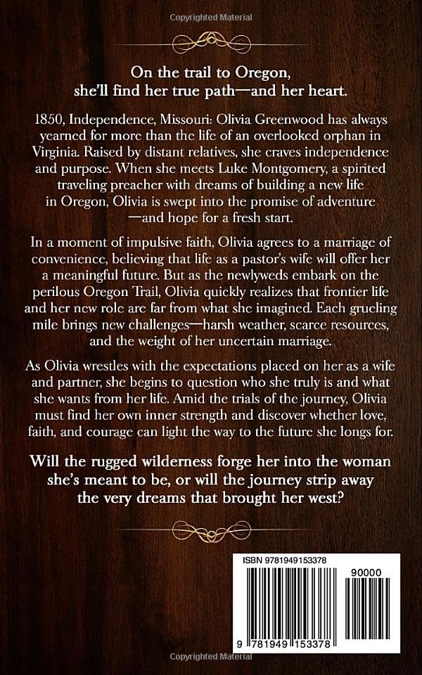 On the trail to Oregon, she’ll find her true path–and her heart. 1850, Independence, Missouri: Olivia Greenwood has always yearned for more than the life of an overlooked orphan in Virginia. Raised by distant relatives, she craves independence and purpose. When she meets Luke Montgomery, a spirited traveling preacher with dreams of building a new life in Oregon, Olivia is swept into the promise of adventure–and hope for a fresh start. In a moment of impulsive faith, Olivia agrees to a marriage of convenience, believing that life as a pastor’s wife will offer her a meaningful future. But as the newlyweds embark on the perilous Oregon Trail, Olivia quickly realizes that frontier life and her new role are far from what she imagined. Each grueling mile brings new challenges–harsh weather, scarce resources, and the weight of her uncertain marriage. As Olivia wrestles with the expectations placed on her as a wife and partner, she begins to question who she truly is and what she wants from her life. Amid the trials of the journey, Olivia must find her own inner strength and discover whether love, faith, and courage can light the way to the future she longs for. Will the rugged wilderness forge her into the woman she’s meant to be, or will the journey strip away the very dreams that brought her west? Faithful Trail is a heartwarming, sweeping saga of one woman’s path to self-discovery and the unexpected love she finds along the way. All the books in the Courage on the Oregon Trail series take place within the same wagon company’s trip west and run concurrently. They can be read in any order.