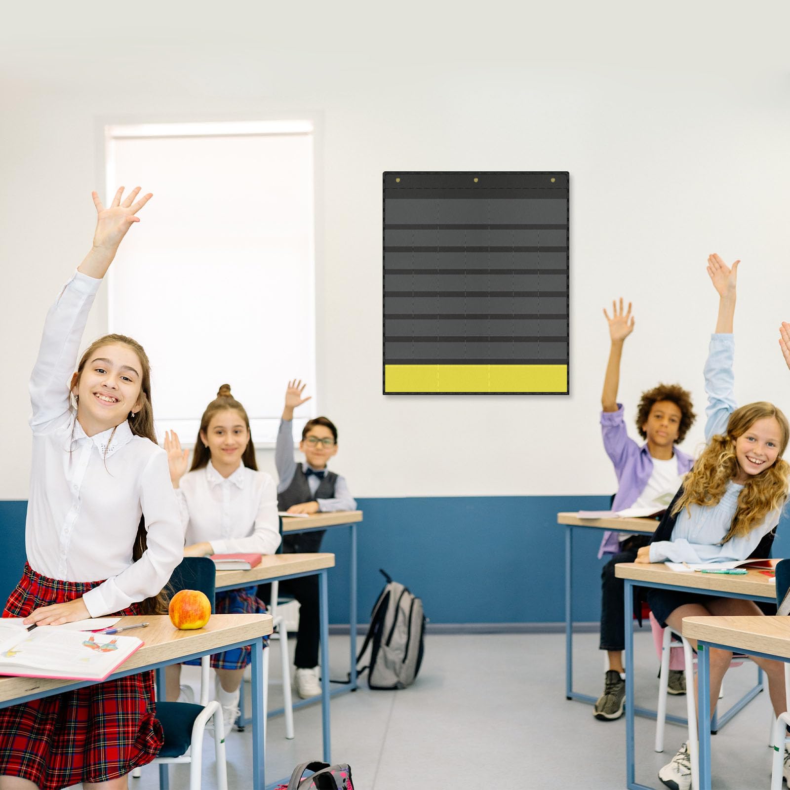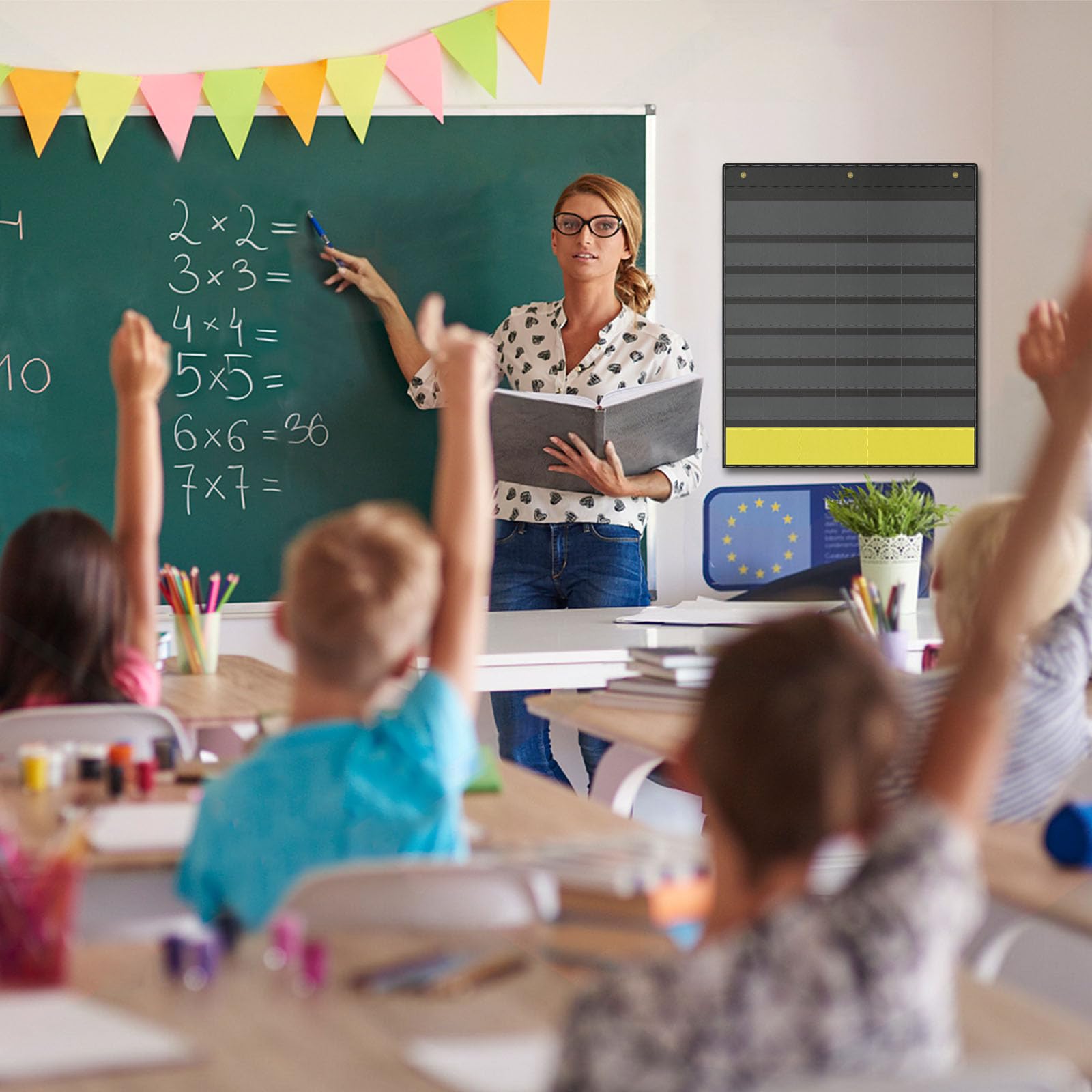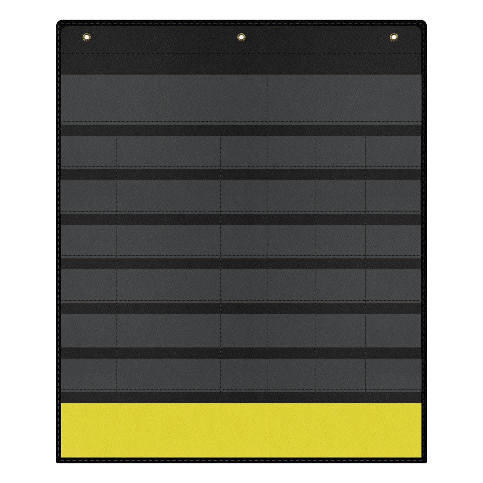 Black calendar pocket chart: The calendar for classroom is made of heavy-duty nylon with sturdy, stitched-on plastic pockets and plus metal grommets for easy hanging