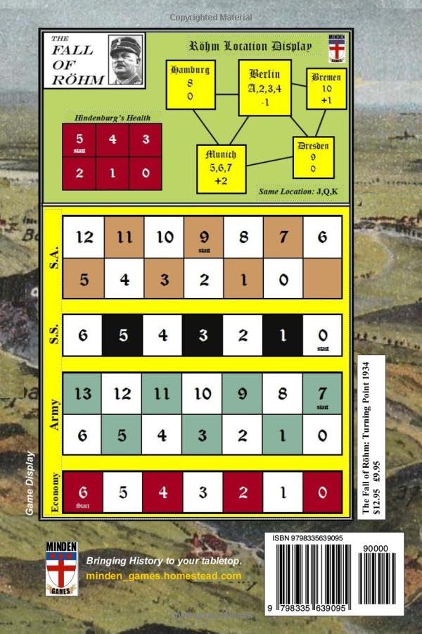 The Fall of Rohm: Turning Point 1934is a simple, abstract solitaire historical game depicting this turbulent time in German history prior to the Second World War. The player–in the role of Hitler’s party leadership–must secure a smooth transition to power when the time comes. Usually, this means effectively dealing with Rohm and the SA, thus satisfying the army and winning their approval for Hitler’s plans for succession. The Fall of Rohm was specifically designed for solitaire play, and may be played with physical components (game display and counters, provided in the pages of the book), or played “pencil-mode”, in which players keep track of the the game’s details on one of the log sheets provided. This means the game may be played during lunch, on a train or plane, or on your game table. This third edition is 54-pages andappears in book format for the first time. It is similar to the previous edition except it now contains several game logs, pencil-mode rules, added historical commentary, and new scenario. You will need to supply a standard deck of 52-playing cards, and one six-sided die to play. Designer: Gary Graber. Publisher: Minden Games