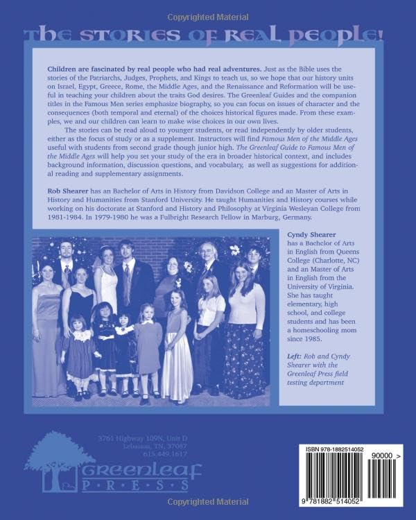 with five new chapters by Rob Shearer, edited and updated by Rob and Cyndy Shearer, The stories begin with the Germanic chiefs: Alaric, Genseric, and Theodoric. Then come stories of the famous kings of the Franks: Clovis, Charles Martel, and Charlemagne. The second half of the book includes Justinian, Mohammed, William the Conqueror, Frederick Barbarossa, Marco Polo, and Joan of Arc. The stories of many of these figures can’t be found for children anywhere else. Don’t just show children pictures of castles; let them read the stories of those who built them and lived in them.Exclusive to the Greenleaf Press version of this classic – Five new chapters written by Rob Shearer on Augustine of Hippo, Patrick of Ireland, Benedict and Gregory, Pope Gregory VII and Emperor Henry IV, and Francis and Dominic. Note: Although other editions may have copied these chapter titles (and borrowed heavily from Rob’s text), only the Greenleaf Press edition has the original chapters written by Rob.