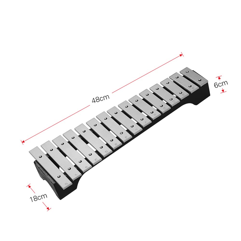 - Large glockenspiel with 15 silver aluminum bars that can make 15 different notes, and the note names is already carved on the bars.