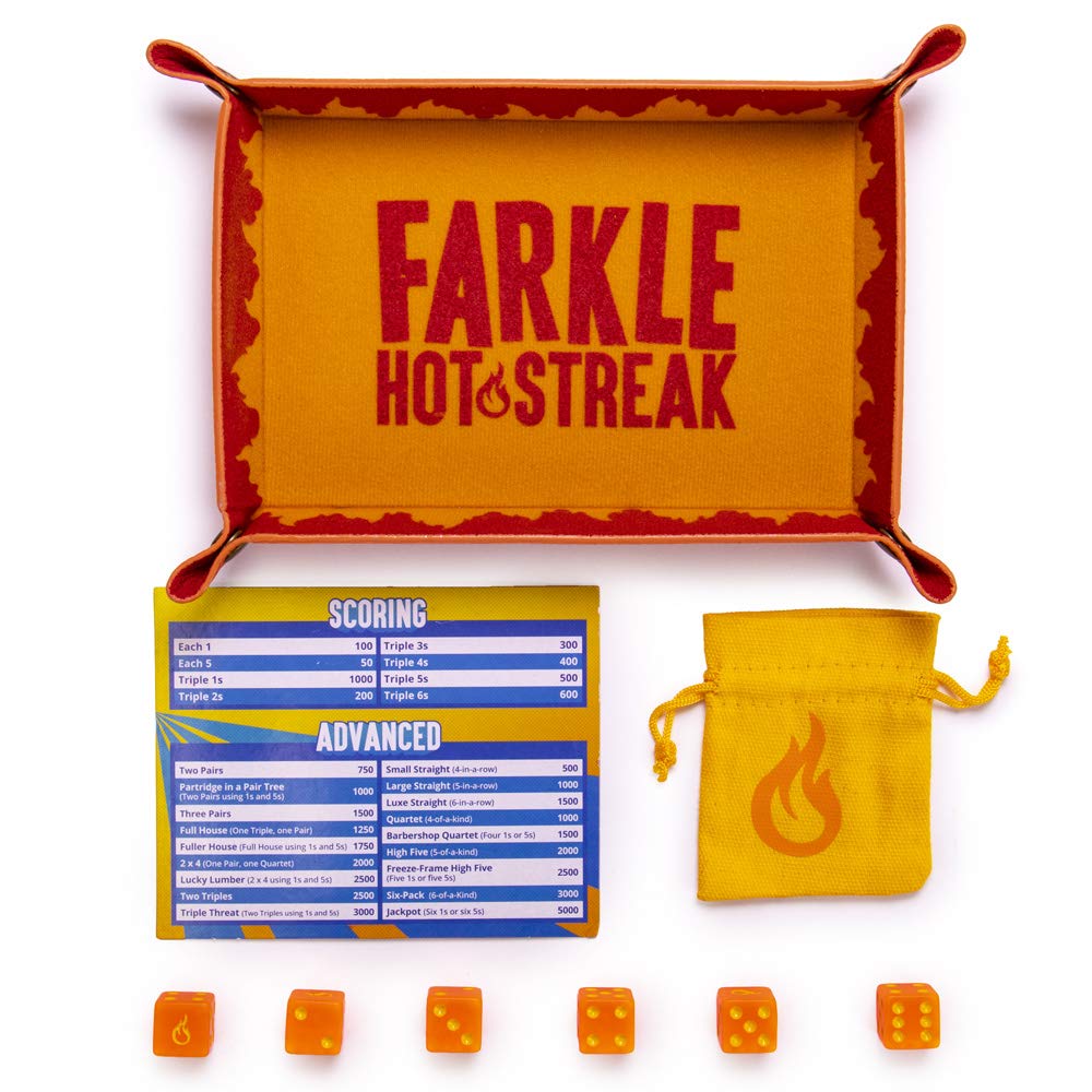 - This set features six flamin’ hot dice, a custom Farkle Hot Streak dice tray, a fiery storage pouch, and the Farkle Hot Streak rule set, complete with scoring and advanced scoring on an instructions card